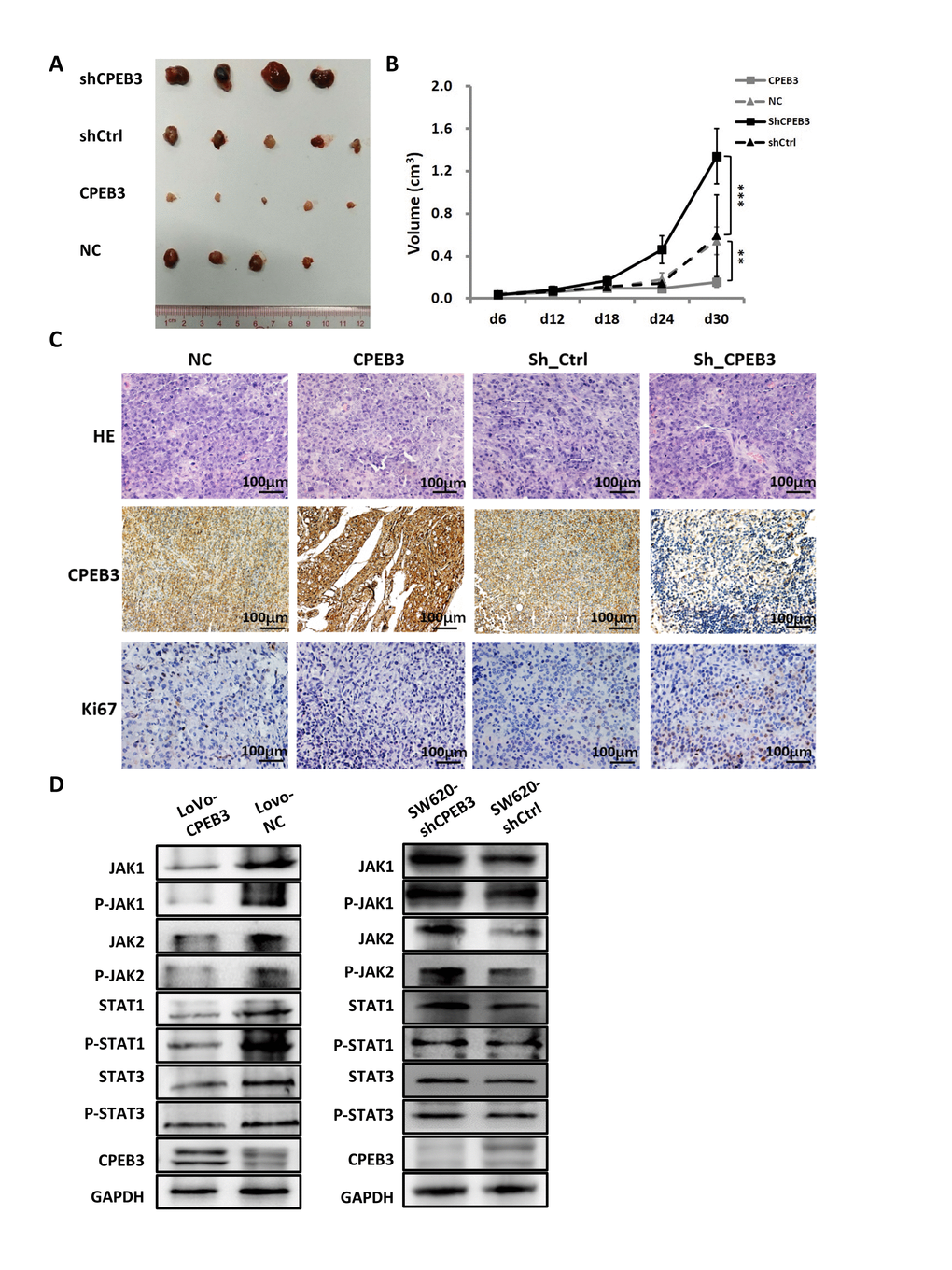 Figure 5. CPEB3 inhibits human colorectal cancer proliferation and JAK/STAT pathway in vivo. (A) Representative images of tumors formed in nude mice subcutaneously implanted with SW480-CPEB3, SW-NC, SW480-shCPEB3 and SW480-shCtrl cell lines. (B) Growth curves of implanted tumors in nude mice (**P< 0.01, ***P< 0.001). (C) Representative immunohistochemical images of tumor xenografts derived from SW480-CPEB3, SW-NC, SW480-shCPEB3 and SW480-shCtrl cell lines stained by anti-CD31 and anti-Ki67 antibodies (Original magnification, ×200). (D) Western blots showed that CPEB3 overexpression suppressed JAK1 and phosphorylated JAK1, as well as molecules in the JAK/STAT pathway while CPEB3 knockdown promoted the activation of these genes.