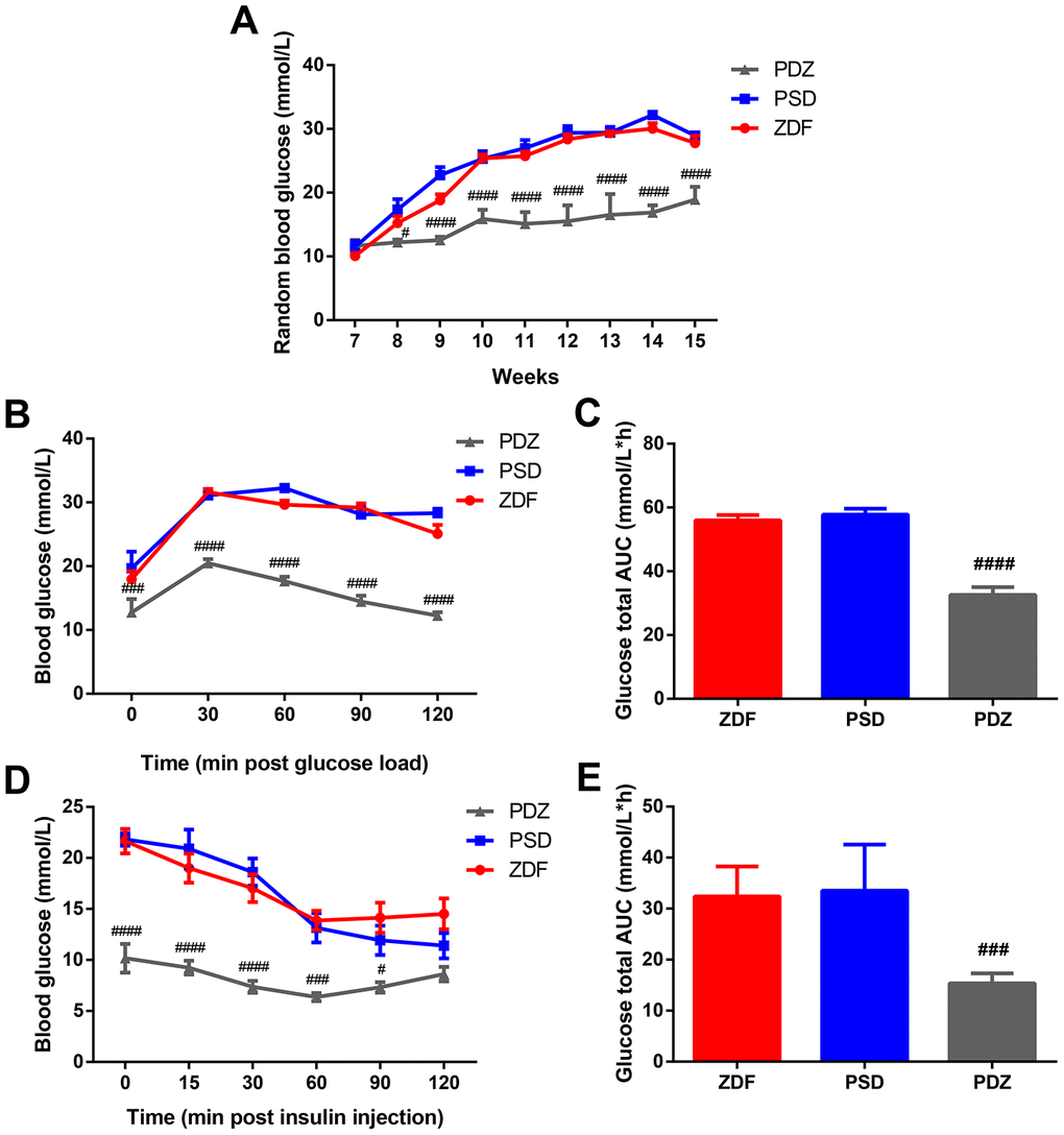 Random blood glucose (RBG) levels were not significantly different between ZDF, PSD, and PS combined with ZBPYR administration (PDZ) groups at week seven. Starting at week eight, the levels of RBG were continuously elevated in ZDF and PSD rats, while in the PDZ group they were significantly lower than those in the two other groups (Figure 1A). Within the oral glucose tolerance test (OGTT) and the insulin tolerance test (ITT), there were significant differences in fasting blood glucose levels between the PSD and PDZ groups (p <0.001), and the blood glucose in the PDZ group almost returned to the level of 0min at the final time point (Figure 1B–1E). It can be inferred, then, that the administration of ZBPYR obviously reduced blood glucose levels and enhanced insulin sensitivity.