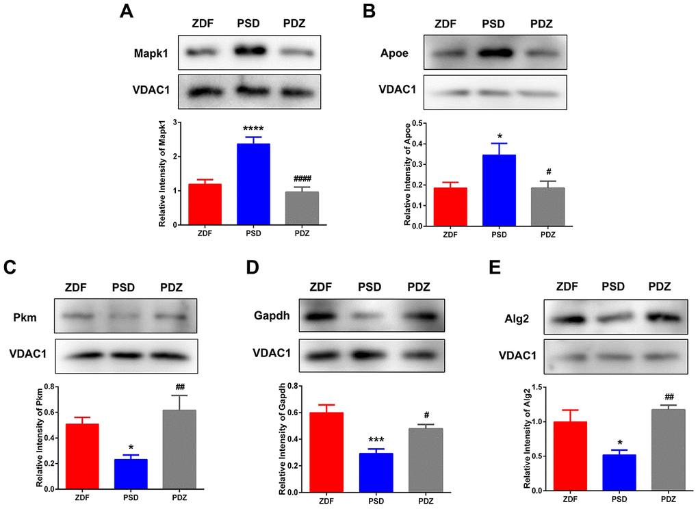 To verify the quantitative results of the iTRAQ-LC/MS/MS experiments, western blotting experiments were performed on five selected DEPs (Apoe, Mapk1, Pkm, Gapdh, and Alg2). There were significantly increased levels of Apoe and Mapk1 in PSD:ZDF rats (Figure 10A, 10B) and significantly decreased levels in PDZ:PSD rats. These experiments also demonstrated that Pkm, Gapdh, and Alg2 expression was decreased sharply in the PSD:ZDF group and that ZBPYR treatment enhanced their expression (Figure 10C–10E).