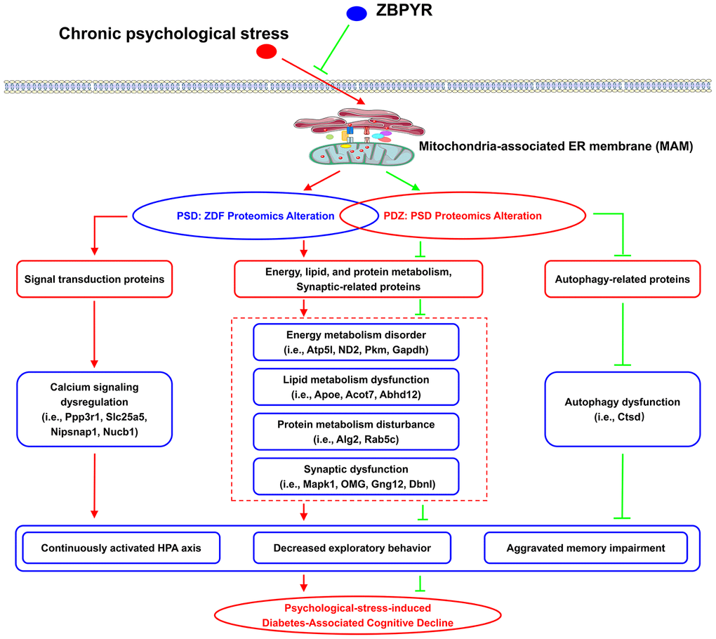 Chronic PS as a common factor in modern life increases the risk of T2DM, but its pathogenesis in T2DM and DACD, generally considered to be a CNS complication of diabetes, is still unclear. In current study, a proteomic analysis on brain MAM samples was adopted to identify protein expression differences in animals with PSD and also to assess the effects of ZBPYR on PSD. We used male Zuker diabetes fatty (ZDF) rat as T2DM model, which is initiated with a mutation in the leptin receptor gene. When fed with a diet of Purina 5008, the ZDF rats exhibit the following characteristics: hyperglycemia, which develops between 7 and 10 weeks of age; early hyperinsulinemia, which rapidly falls as the beta cells fail; Insulin resistance and abnormal glucose tolerance, which becomes progressively worse with age; and spatial cognitive impairment, which occurs at 16 weeks of age.