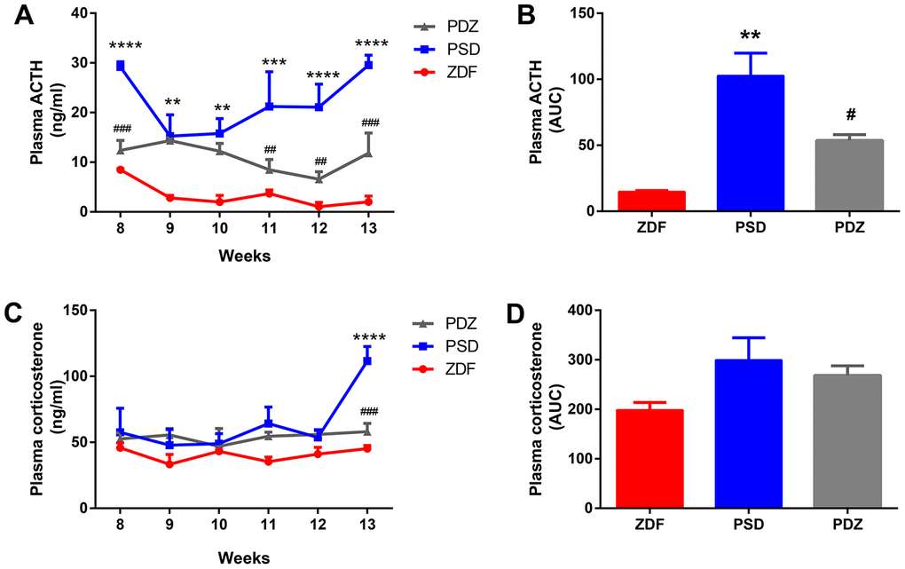 In weeks 8 to 13, the concentration of ACTH in the PSD group was always significantly higher than that in the ZDF group (p <0.01, Figure 2A, 2B). Additionally, the corticosterone (CORT) concentration of the PSD group was significantly higher than that of the ZDF group at week 13 (p <0.0001, Figure 2C). Compared with the PSD group, the ACTH concentration in the PDZ group was significantly downregulated at weeks 8, 11, 12, 13, while the CORT concentration was significantly downregulated at week 13 (p <0.01, Figure 2A, 2C). Indeed, the administration of ZBPRY significantly attenuated the excessive sustained activation of the HPA axis.