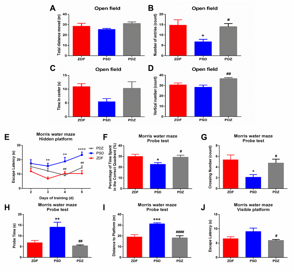 We used the Morris Water Maze (MWM) to measure the effects of different treatments on spatial learning and memory. In the hidden platform test, the escape latency of the ZDF group was shorter than that of the PSD group on days 3-5, while the PSD group escape latency was longer than the PDZ group on days 4 and 5 (p <0.01, Figure 3E). In the probe test, compared with the PSD group, the percentage of time spent in the correct quadrant and the platform crossing number were both significantly increased in the PDZ group (p <0.05, Figure 3F, 3G). Additionally, PDZ rats swam shorter distances and required less time to locate the original platform position (p <0.01, Figure 3H, 3I). In the visible platform version of the test, the escape latency of the PDZ group was shorter than that of the PSD group (p <0.05, Figure 3J). Indeed, ZBPYR administration evidently improved spontaneous locomotor activities and cognitive decline in the PSD group.