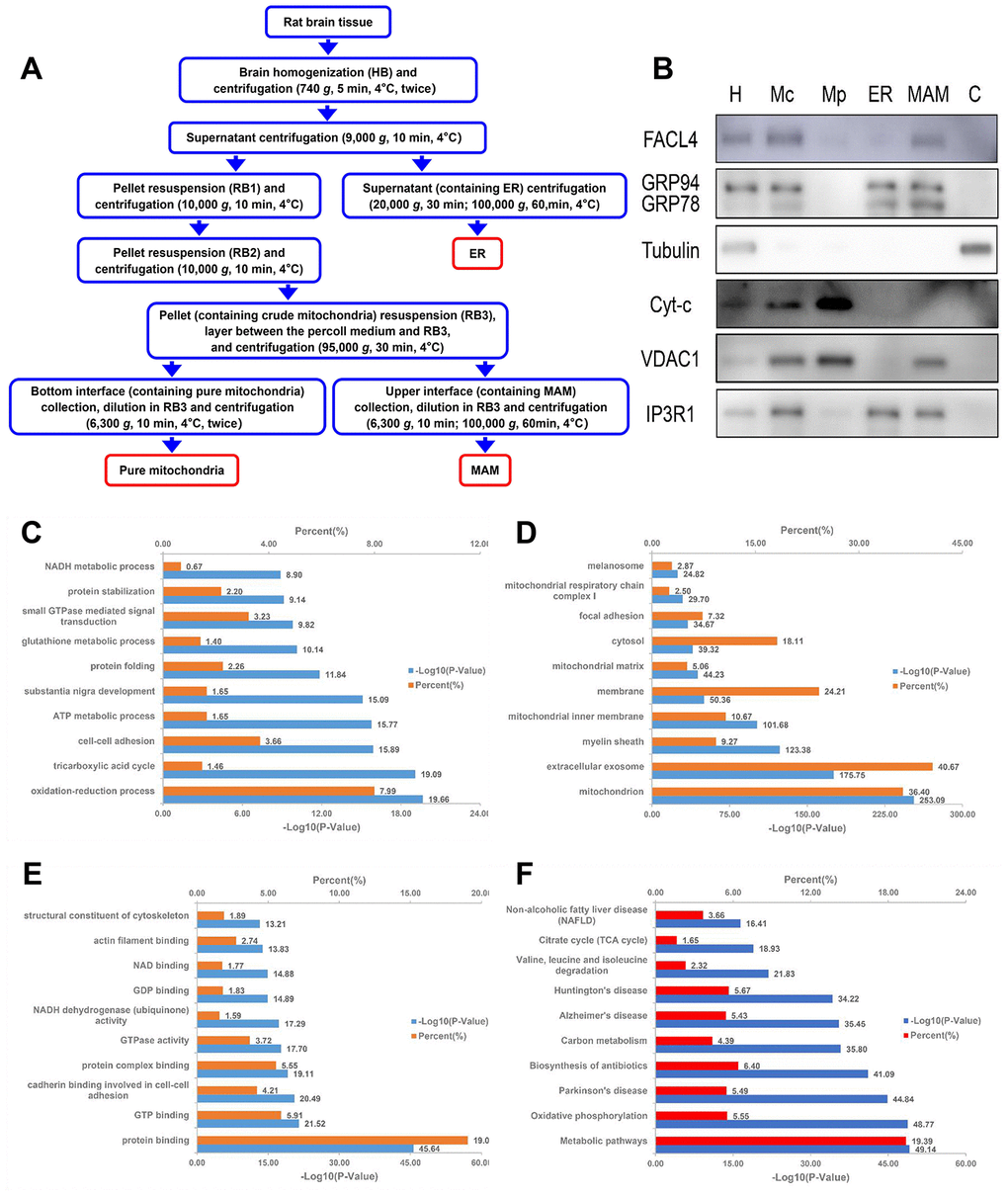 To validate the quality of MAM preparations from rat brains, three independent methods were used. First, the different steps of MAM preparation from ZDF rat brains (n=3) were quality controlled by western blot analysis (Figure 4A, 4B). The distribution trend of seven molecules, such as the MAM marker acyl-CoA synthetase long chain 4 (ACSL4/FACL4), in different fractions was consistent with previously published data [9, 10]. Secondly, LC-MS/MS protein identification of MAM preparations revealed that MAM fractions contained five known characteristic MAM proteins, namely Apoe, Fis1, S100B, Cisd2, and Bcap31 (Supplementary Table 1). Furthermore, 32 of these proteins are associated with cognitive impairment and 12 are associated with diabetes mellitus. Finally, according to the enrichment analysis of MAM samples, most of the enriched cellular components (e.g., mitochondrion and the ER), biological processes (e.g., cell redox homeostasis and glucose metabolic processes), molecular functions (e.g., GTP binding, NAD binding, and GTPase activity), and Kyoto Encyclopedia of Genes and Genomes (KEGG) pathways (e.g., Alzheimer's disease and oxidative phosphorylation) are strongly related to mitochondrial-ER processes (Figure 4C–4F).