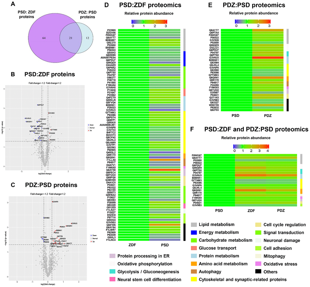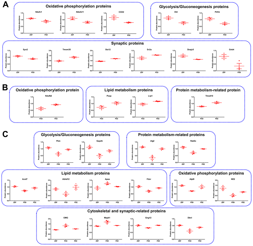 Based on the results of functional analysis, 11, 4, and 14 representative proteins in the PSD:ZDF, PDZ:PSD and PSD:ZDF/PDZ:PSD combined groups were selected for protein abundance analysis, respectively (Figure 9). The common proteins in both groups are the glycolysis/gluconeogenesis proteins Pkm and Gapdh, protein metabolism-related proteins Alg2 and Rab5c, lipid metabolism proteins Acot7, Abhd12, Apoe, and Fdxr, OXPHOS proteins Atp5l and ND2, and cytoskeletal and synaptic-related proteins OMG, Mapk1, Gng12, and Dbnl (Figure 9C).