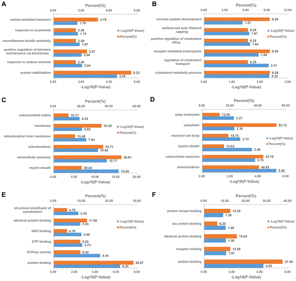 In PSD:ZDF rats, altered biological processes included the strong enrichment of protein stabilization, response to sodium arsenite, and positive regulation of telomere maintenance via telomerase (Figure 7A). Cellular component annotation demonstrated a strong enrichment of the myelin sheath, extracellular exosome, and mitochondrion (Figure 7C). An analysis based on the molecular functions showed that the majority of the DEPs were associated with two major functions. One of these functions is binding, including protein binding, GTP binding, NAD binding, and identical protein binding. The other function is catalyst activity, including GTPase activity (Figure 7E). In the PDZ:PSD group, the biological process revealed that the DEPs primarily involved in cholesterol homeostasis, including cholesterol metabolic processes, regulation of cholesterol transport, and positive regulation of cholesterol efflux (Figure 7B). Additionally, a GO analysis showed similar results with those in the PSD:ZDF group in regards to cellular components and molecular functions (Figures 7D, 7F).