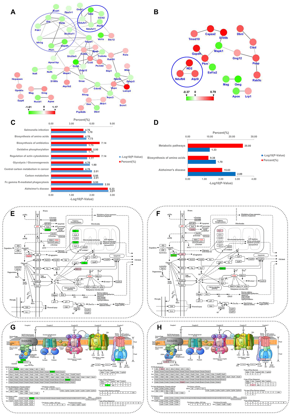 The DEPs were classified into 22 pathways in the PSD:ZDF group and five pathways in the PDZ:PSD groups. In the PSD:ZDF group, KEGG pathway annotation revealed a strong enrichment of pathways such as Alzheimer's disease (AD) and oxidative phosphorylation (OXPHOS; Figure 8C). There were seven DEPs (i.e., Apoe, Ndufv1, Ndufa11, COX2, Gapdh, Mapk1, and Ppp3r1) observed in the AD pathway and five DEPs (i.e., Ndufv1, Ndufa11, COX2, Atp5l, and ND2) were observed in the OXPHOS pathway (Figure 8E, 8G). In the PDZ:PSD group, the AD pathway was also strongly enriched (Figure 3D). Furthermore, five DEPs (i.e., Lrp1, Apoe, Ndufb6, Gapdh, and Mapk1) were found in the AD pathway and three proteins (i.e., ND2, Ndufb6, and Atp5l) were found in the OXPHOS (Figure 8F, 8H).