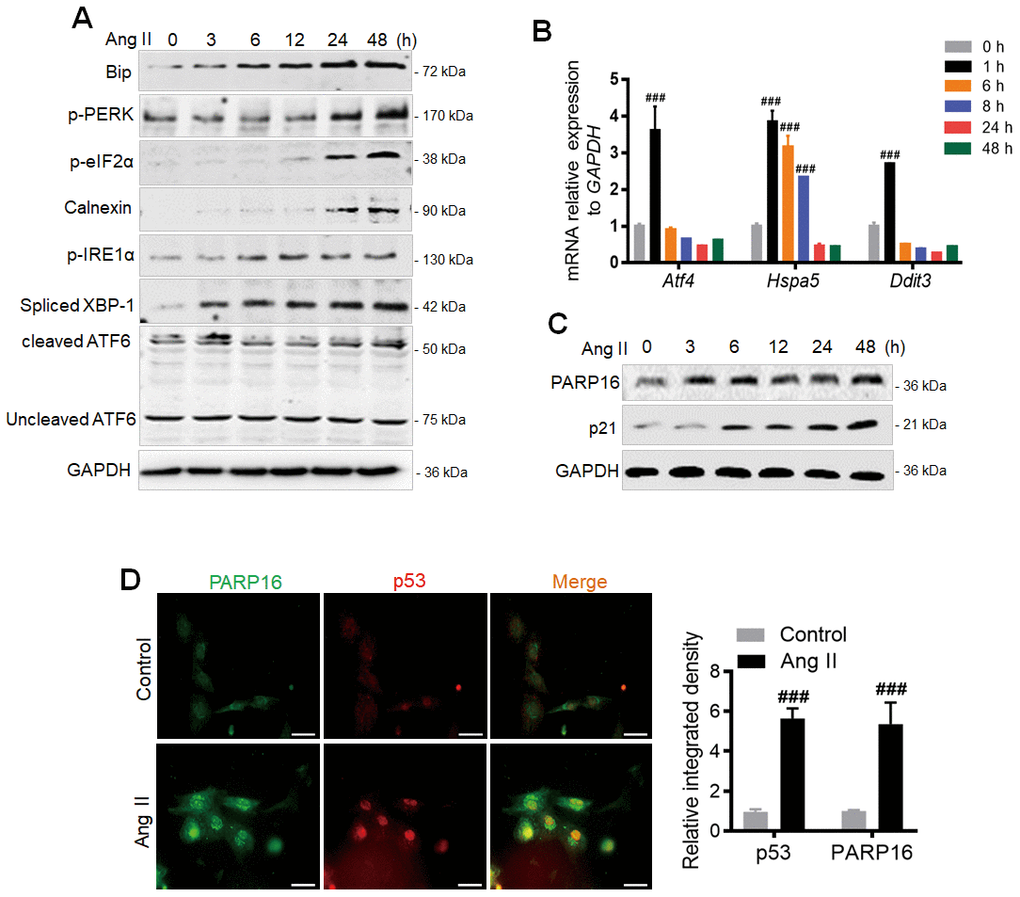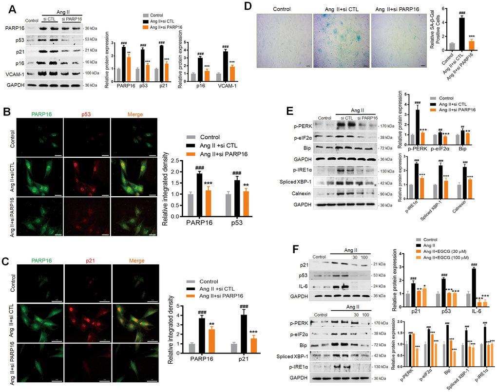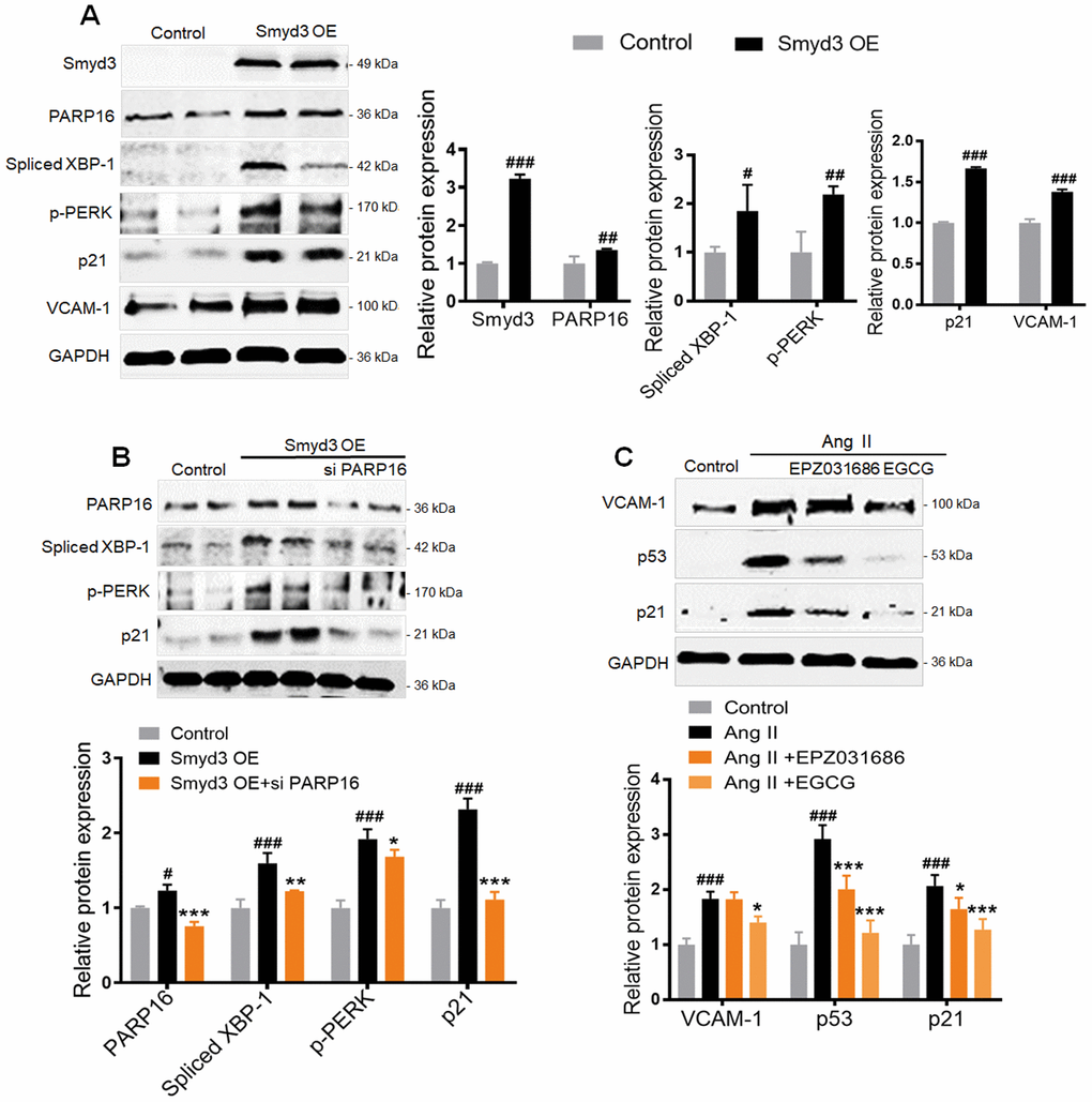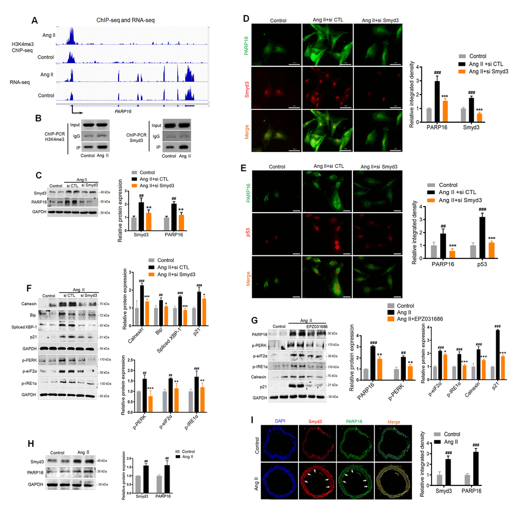 Reagent sources were as follows: angiotensin II (Ang II), epigallocatechin gallate (EGCG, a PARP16 inhibitor), 4μ8C (a specific IRE1 inhibitor) and ISRIB (a specific PERK inhibitor) were purchased from Meilunbio (Meilun Biotechnology, Dalian, China). EPZ031686 was purchased from MCE (MedChemExpress, USA). Antibodies were obtained from the following commercial sources: PARP16, Smyd3, H3K4me3, Bip and XBP-1 were purchased from Abcam; VCAM-1, Calnexin, and GAPDH was purchased from Proteintech (Proteintech, USA); IL-6 and iNOS were purchased from Epitomics (Burlingame, CA); p-PERK, p-eIF2α, p53, p21 and p16 were purchased from Cell Signaling Biotechnology (Danvers, MA, USA); p-IRE1α were purchased from Thermo Fisher (MD, USA); ATF6 was purchased from Bioss (Bioss Antibodies, Beijing, China).