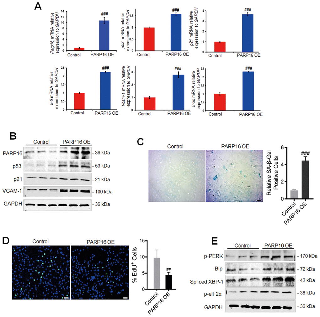 To examine whether PARP16 plays a causal role in regulating ER stress and vascular cell senescence, we overexpressed PARP16 in RAEC cells (Figure 2A). Intriguingly, overexpression of PARP16 in RAECs led to elevated mRNA and protein levels of senescence markers p53, p21, and VCAM-1, but also increased mRNA levels of senescence-associated secretory phenotype genes including Il-6 and Inos genes (Figure 2A, 2B). More percent of cells displayed SA-β-Gal staining when PARP16 overexpressed (Figure 2C). Decreased EdU incorporation level was also observed in PARP16 overexpressing cells (Figure 2D). The above evidence supports that higher level of PARP16 alone promotes multiple key phenotypes that associated with vascular cell senescence. To further determine whether PARP16 functions during UPR, we overexpressed PARP16 in RAECs and examined the key markers of ER stress induced UPR. Consistent with the unfolded protein response upon Ang II induction, overexpression of PARP16 led to increased levels of p-PERK, Spliced XBP-1, p-eIF2α and Bip, the well-known ER stress markers (Figure 2E). These results indicate that PARP16 can promote both unfolded protein response and cellular senescence.