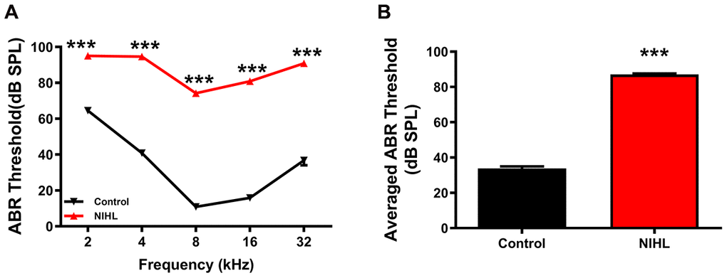 The auditory brainstem response (ABR) frequency-threshold curve obtained at 3 weeks post-exposure was significantly higher in NIHL mice than in control mice at all frequencies, ranging from 2-32 kHz (Figure 1A, two-way repeated measures ANOVA (F1, 89 =2264.37, Tukey’s post hoc test P<0.001)). The mean threshold of the NIHL group was significantly higher than that of the control group (Figure 1B, 87.08±0.5702 dB SPL vs. 33.82±1.159 dB SPL, P<0.0001).
