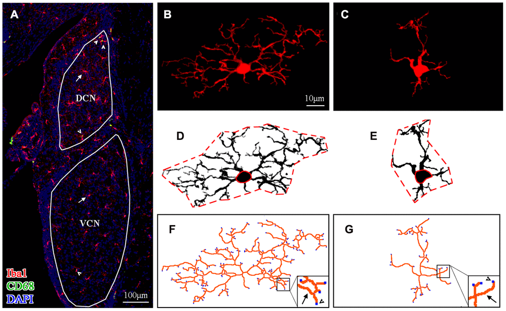 Figure 3A shows the distribution of microglial cells in the auditory brain regions of interest, with the ventral cochlear nucleus (VCN) and dorsal cochlear nucleus (DCN) serving as examples. Representative maximum intensity projections of confocal images of an Iba1-labeled ramified microglial cell and an Iba1-labeled activated microglial cell are shown in Figure 3B and 3C, respectively. For morphological analysis, the maximum intensity projection of Iba1-positive fluorescence was converted to a binarized format (Figure 3D, 3E) and then skeletonized (Figure 3F–3G) using ImageJ software. Data on the soma area (delineated by the solid red line in Figure 3D, 3E), territory area (delineated by the dotted red line in Figure 3D, 3E), total process length (orange lines in Figure 3F, 3G), and total number of process endpoints (blue spot in Figure 3F, 3G) for individual microglia were assessed.