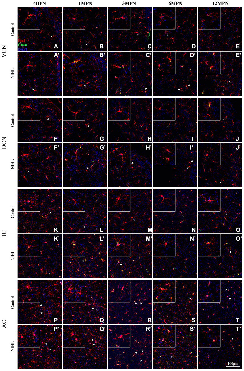 Figure 4 shows representative confocal images of microglial cells stained for Iba-1 and CD68 from each group across different regions and time points. Similar to previous reports [21, 32, 42], the microglia exhibited heterogeneous morphologies in terms of cell density and process ramification in a region- and age-dependent manner. In the control mice, microglial cells in the VCN, DCN, inferior colliculus (IC) and auditory cortex (AC) displayed slight alterations in morphology with aging, ranging from the very delicate arborization of processes at 4 DPN (Figure 4A, 4F, 4K, and 4P) to shorter processes with fewer branches and even abnormally twisted processes at 12 MPN (Figure 4E, 4J, 4O, and 4T), accompanied by a slight increase in CD68 occupancy, accompanied by slightly increased CD68 occupancy, representing an aging phenotype of microglia [32, 43, 44].