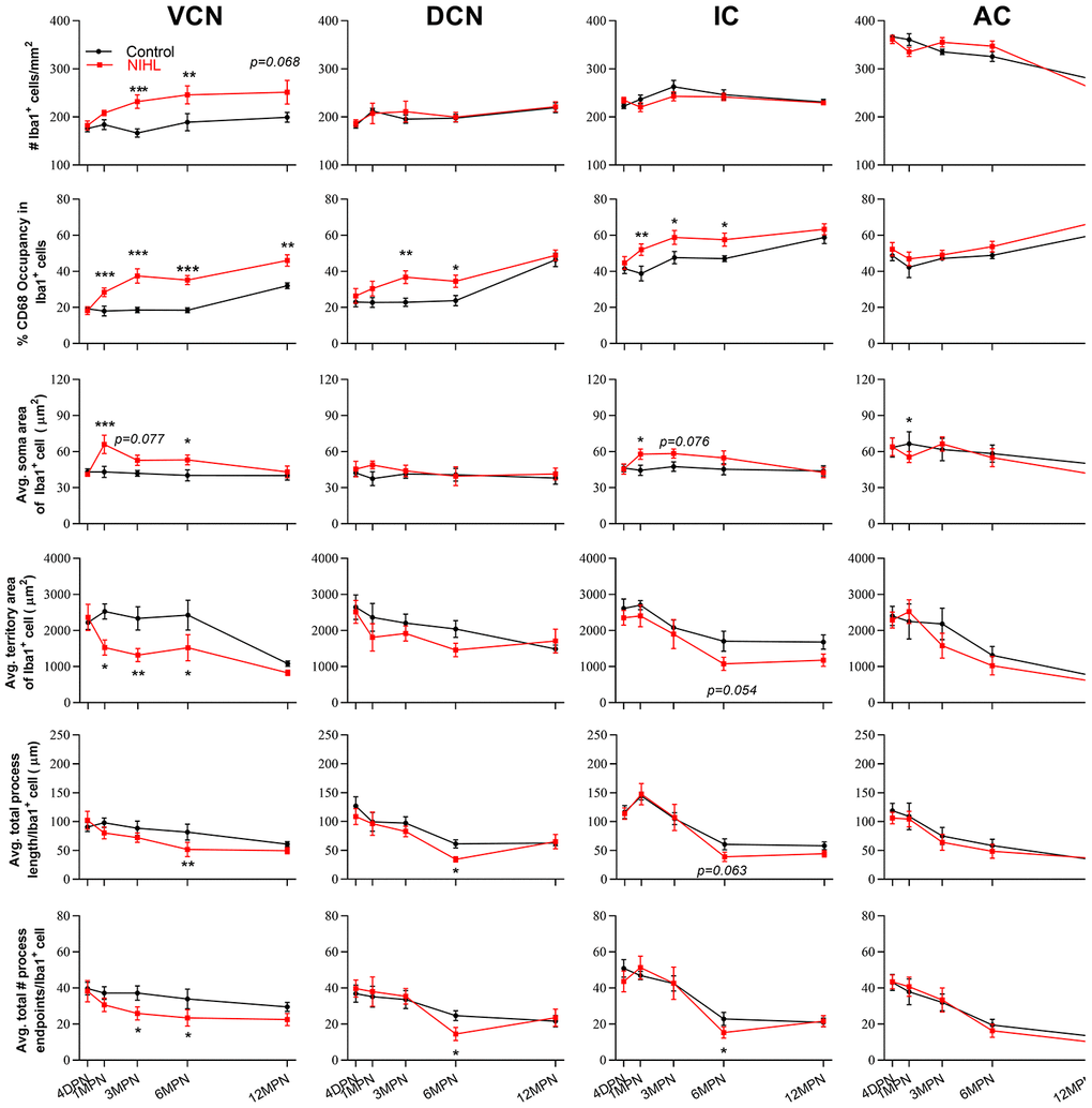 Post hoc pairwise comparisons (Figure 5, Tukey method) revealed that compared to controls, the microglia in the VCN of the NIHL animals displayed significant increases in cell density at 3 MPN and 6 MPN, CD68 occupancy from 1 MPN to 12 MPN and average soma body size at 1 MPN and 6 MPN and significant decreases in average territory area at 1 MPN, 3 MPN and 6 MPN, total process length per cell at 6 MPN and total process endpoints per cell at 3 MPN and 6 MPN. Significantly higher CD68 occupancy than the control was also shown in the DCN at 3 MPN and 6 MPN and in the IC at 1 MPN, 3 MPN, and 6 MPN in the NIHL group. As CD68 is also expressed by homeostatic microglia and upregulated by immune challenges or increased activities, the phagocytic activity of microglia was also evaluated by assessing CD68-immunopositivity (CD68 immunofluorescence integrated density/Iba1 immunofluorescence integrated density within Iba1+ cells) [48]. Consistent with the results of the CD68 occupation analysis, significant increases in CD68 immunoreactivity were observed in NIHL animals (see Supplementary Figure 1). Taken together, these data demonstrated that after acquired HL, prolonged (up to 6 months after noise exposure) microglial activation occurred not only in the CN, which has been illustrated by previous reports [12, 13, 15, 16], but also in the upper part of the auditory brain region.