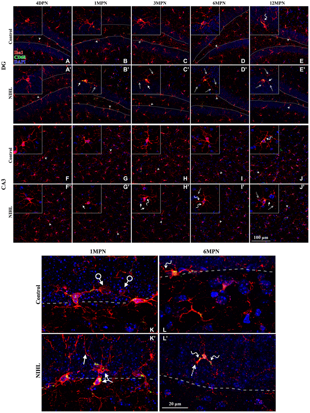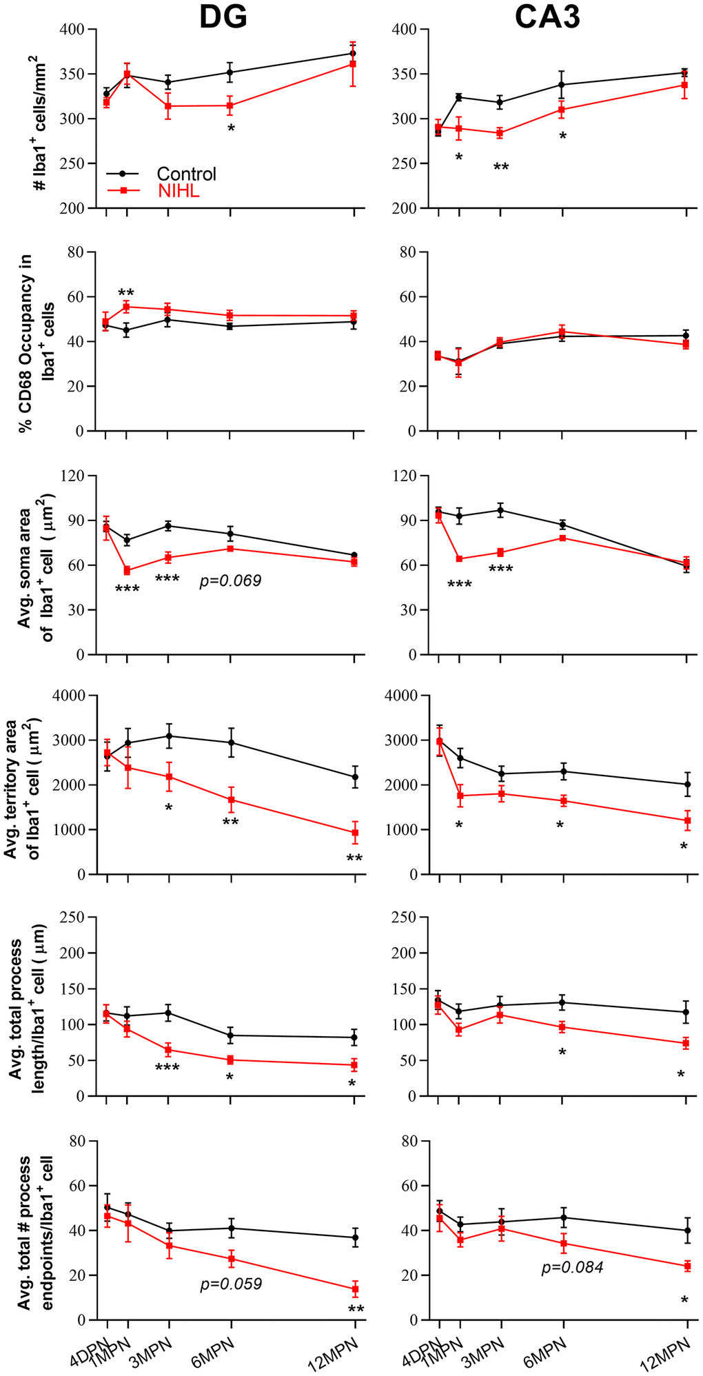Qualitative assessment of cell morphology is a reliable way of distinguishing among ramified, activated, and dystrophic microglia [34]. A recent study performed using postmortem human hippocampal tissues revealed marked microglial degeneration in patients with AD, which was particularly evident in the DG and CA3 subfields [85]. The DG-CA3 region plays a key role in sensory (including auditory) information processing by the hippocampus [40] and was reported to be highly sensitive to changes in sensory input [96]. Thus, we focused our attention on microglial morphology in the DG and CA3. In line with previous reports [34, 97], we observed age-related changes in microglial morphology, including shrinkage of the cell soma and territory area and decreased cell complexity. Compared to microglia in aged-matched controls, microglia in NIHL mice display significant reductions in cell density, soma area, territory area, process length and process endpoints, with the exception of 4 DPN. Furthermore, at 6 MPN and 12 MPN, fragmented microglia (the principal feature of microglial dystrophy [32, 34, 47, 98]) lacking an intact morphology were observed more frequently in NIHL brains than in control brains. All these data suggest that aggravated age-associated microglial degeneration occurs in NIHL mice.