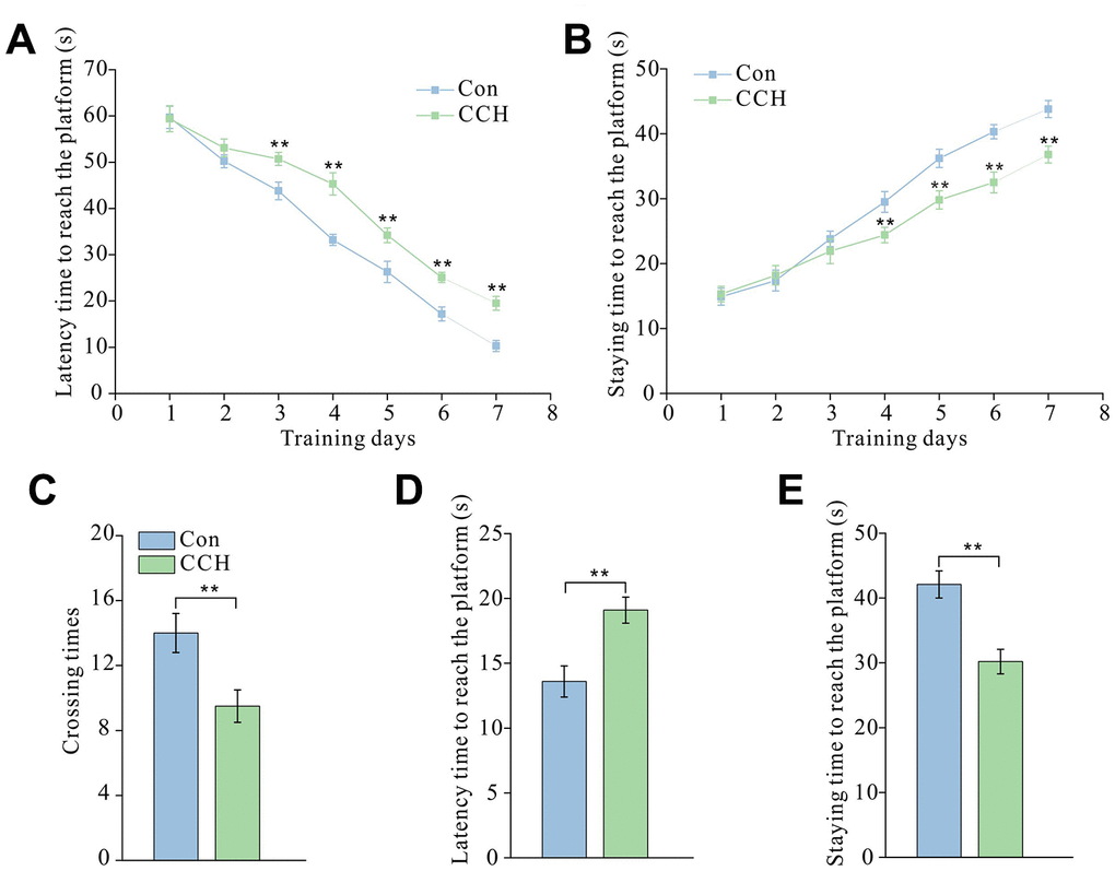 The results of the Morris water maze test showed that CCH rats had a much longer latency time to reach the platform from the third to seventh training day than the sham control rats (P < 0.01) (Figure 1A). CCH rats spent noticeably less time in the platform area from the fourth to seventh training day than the sham control rats (P < 0.01) (Figure 1B). After 7 days of training and 1 day of rest, the short-term memory test showed that the CCH rats had a dramatically longer latency time to reach the platform than sham rats (P < 0.01) (Figure 1C). After removing the platform, CCH rats spent less time in the platform area and less crossing time around the platform area than the sham control rats (P < 0.01) (Figure 1D–1E).
