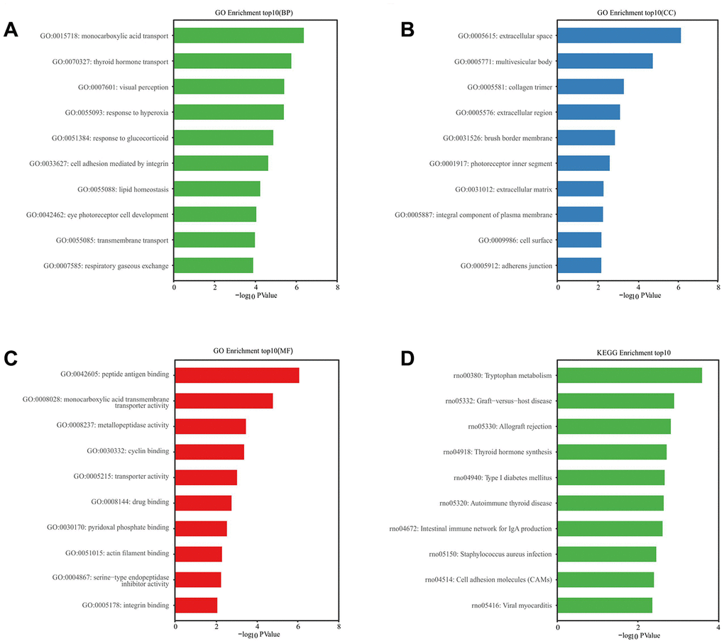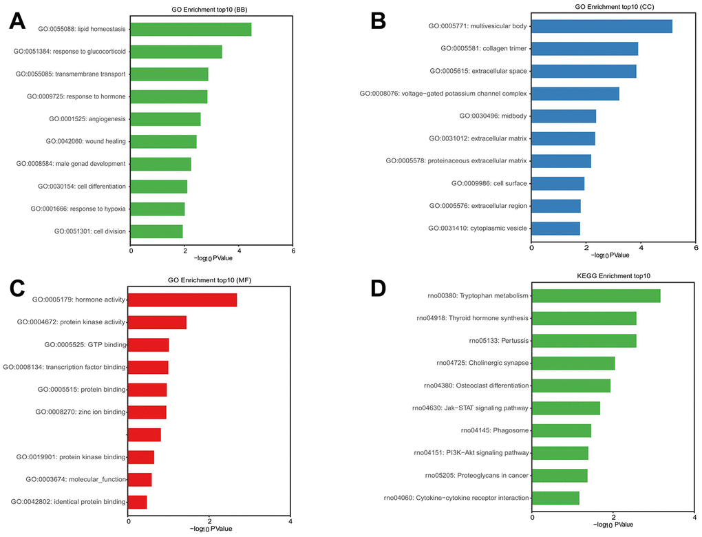 To further predict and analyze the probable functions and pathway of DE mRNAs regulated by DE lncRNA-miRNA, GO and KEGG analysis were performed. The GO analysis showed that the most enriched mRNAs related to lipid homeostasis (GO: 0055088) in biological processes (Figure 10A), the multivesicular body (GO: 0005771) in the cellular component, and hormone activity (GO: 0005179) in the molecular functions (Figure 10B, 10C). KEGG pathway analysis showed that the top 10 deferentially-enriched KEGG pathways related to dysregulated mRNAs were involved in tryptophan metabolism, thyroid hormone synthesis, pertussis, cholinergic synapse, osteoclast differentiation, the Jak-STAT signaling pathway, phagosome, the PI3K-Akt signaling pathway, proteoglycans in cancer, and cytokine-cytokine receptor interaction (Figure 10D).