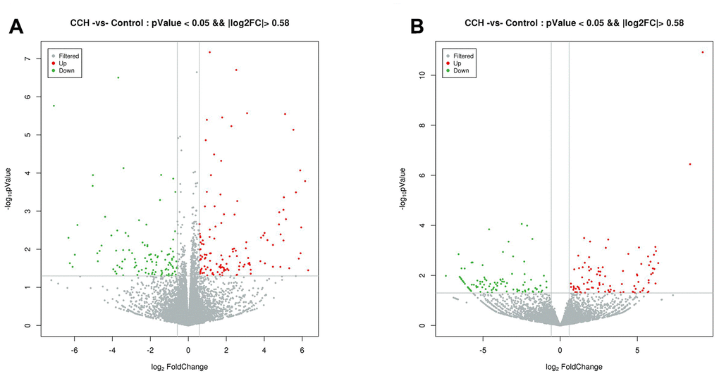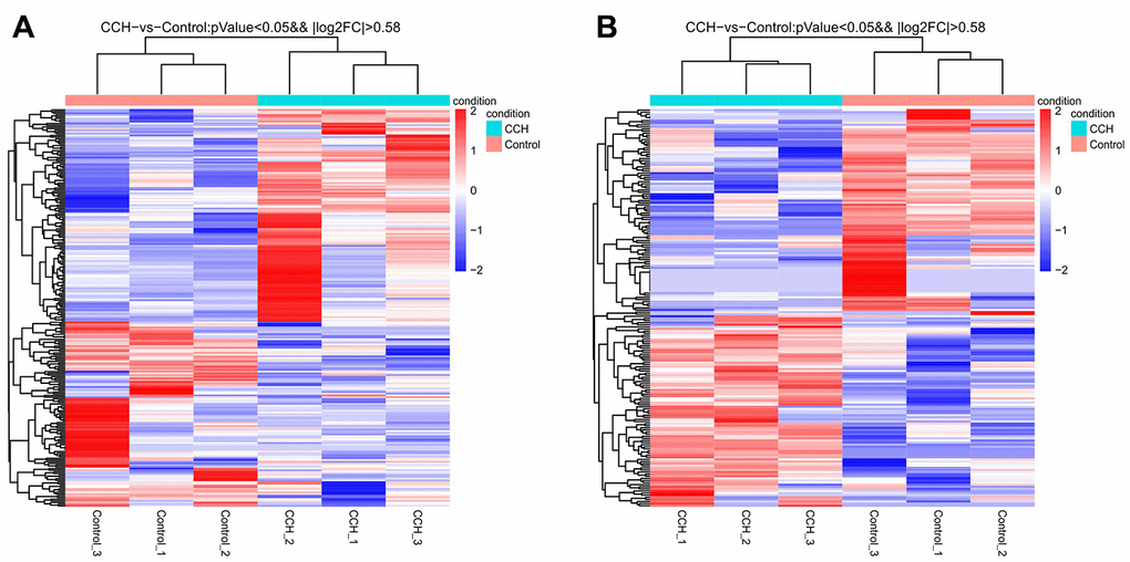 The most up-regulated mRNAs and lncRNAs were Sftpa1 and TCONS_00019175, with FCs of 79.54 and 689.55, respectively compared to sham controls. The most down-regulated mRNAs and lncRNAs were Cdh17 and ENSRNOT00000092488, with FCs of 13.38 and 182.18, respectively compared to sham controls. The top 20 up-regulated and 20 down-regulated lncRNAs and mRNAs in the CCH group are listed in Tables 1 and 2. The clustering analysis and volcano plot visualization showed dramatically different expression levels of mRNAs and lncRNAs in the CCH and sham groups (Figures 3 and 4).