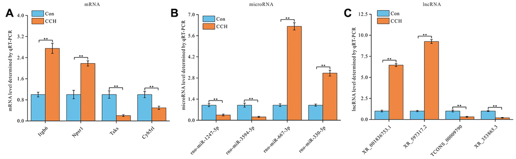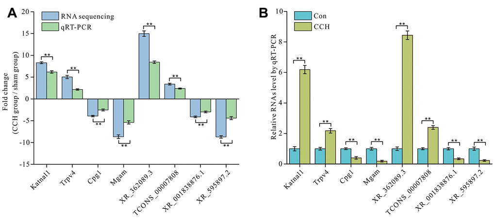 In order to verify the validity of RNA sequencing, we randomly selected two differentially up-regulated mRNAs of Katnal1 and Trpv4 and down-regulated mRNAs of Mgam and Cpg1 and two differentially up-regulated lncRNAs of XR_362089.3 and TCONS_00007808 and down-regulated lncRNAs of XR_001838876.1 and XR_595897.2 for detection by qRT-PCR. The qRT-PCR results showed that the change trends of the selected mRNA and lncRNA levels determined by qRT-PCR were consistent with these by RNA sequencing. This showed that the RNA sequencing data was valid (Figure 5A). The levels of Katnal1 and Trpv4 in hippocampus of CCH group were significantly up-regulated than in that of sham group (P<0.01), whereas Mgam and Cpg1 in hippocampus of CCH group were significantly down-regulated than in that of sham group (P<0.01) (Figure 5B). Similarly, up-regulation lncRNAs of XR_362089.3 and TCONS_00007808 and down-regulation lncRNAs of XR_001838876.1 and XR_595897.2 were noticeable in CCH group than in sham group (P<0.01) (Figure 5B). The primers used in qRT-PCR are listed in Table 3.