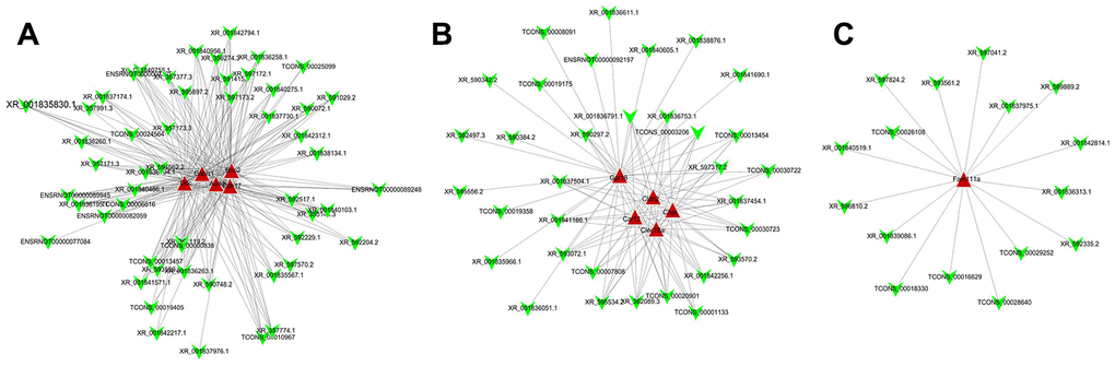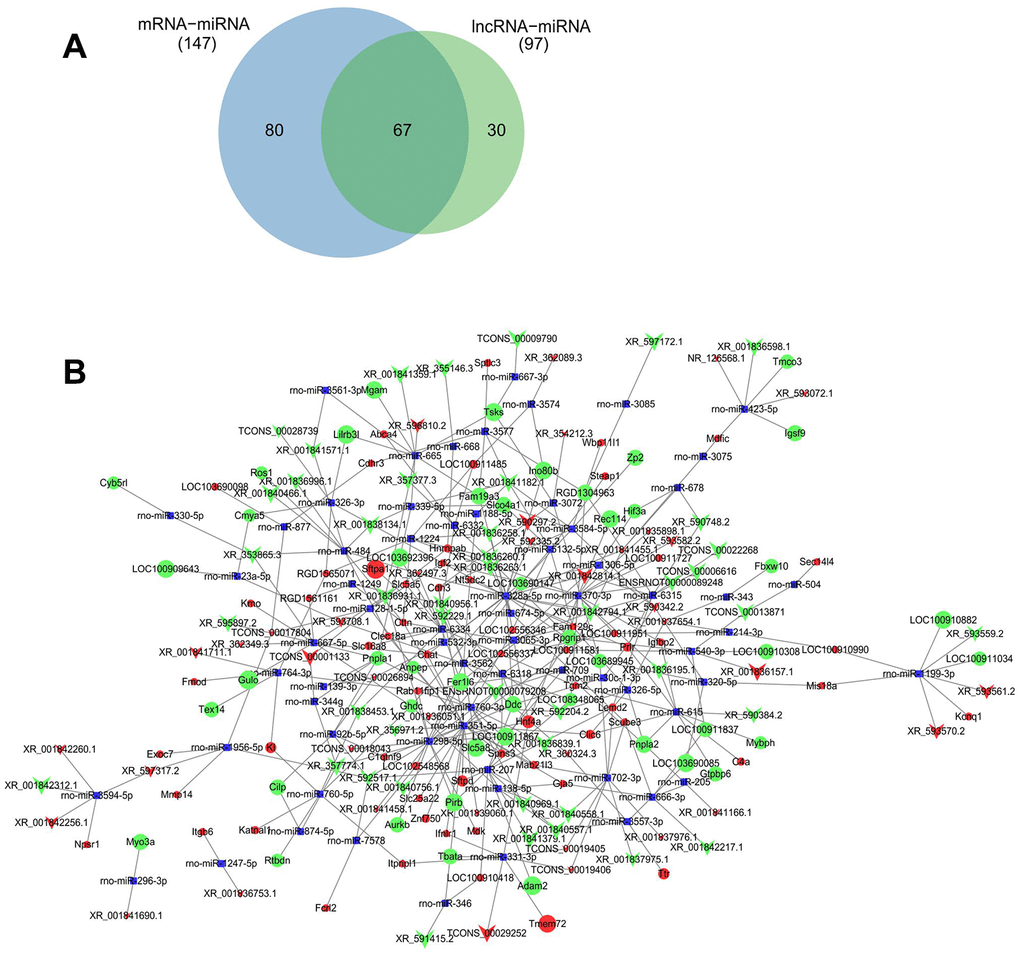 The miRbase database and the miRanda program (v. 3.3a) [52] were used to predict the binding between these miRNA-differential mRNA/different lncRNA sequences, using the default parameters of miRanda v. 3.3a (S ≥ 150, ΔG ≤ −30 kcal/mol and demand strict 5' seed pairing), which predicts the miRNA bound to lncRNA and mRNA, respectively, and then takes the intersection to find the miRNA bound to both. S referred to the single residue pair match scores of the matching area, and ΔG referred to free energy of the double chains binding. Then, the intersecting miRNA and the corresponding lncRNA and mRNA were used to construct a ceRNA regulatory network of lnc-miRNA-mRNA using Cytoscape software [53].