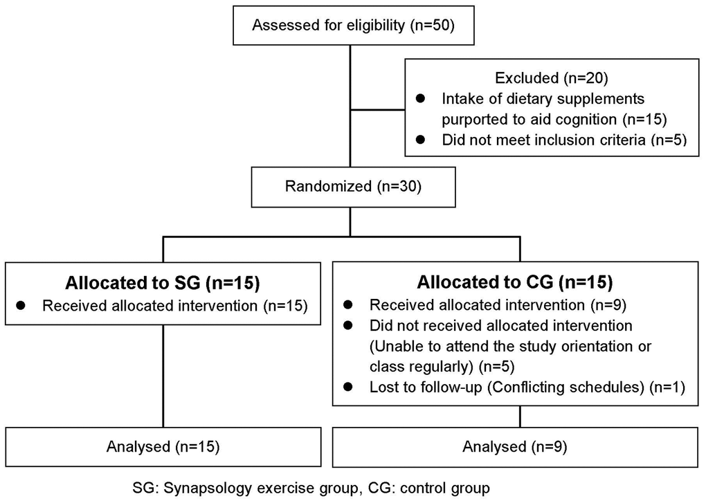 A total of 50 older adults agreed to participate in our study (Figure 2). Among them, 20 applicants did not meet the inclusion criteria (intake of dietary supplements purported to aid cognition, having an acute phase of a disease). Thus, a total of healthy 30 older adults who lived in the local community participated in the study. During the training period, six participants (CG) dropped out during the physical function evaluation because of conflicting schedules or their participation in strength training twice a week. Twenty-four participants (SYNAP exercise group (SG): 15, Control group (CG): 9) completed the 8-week trial.