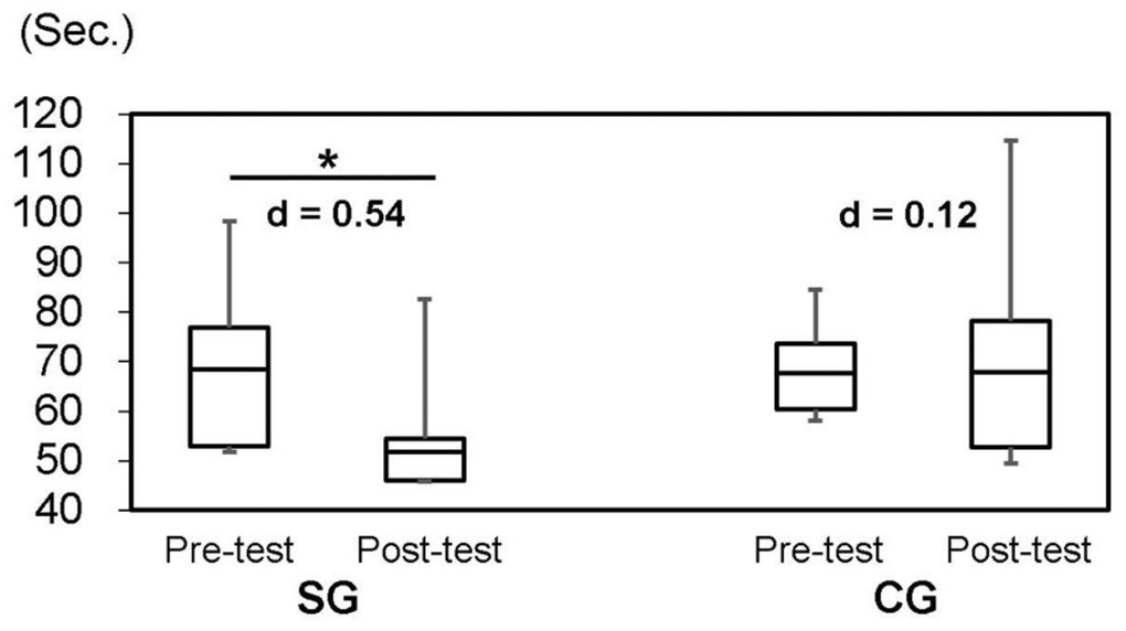 Kellor et al. originally introduced the peg test in 1971 as a measurement of dexterity [27]. It generally consists of a 9-hole peg board, which is considered vital for measuring dexterity. It is widely used in the assessment of cognitive function for neurological disorders together with a commercial version. More detailed information was gathered regarding the change in cognitive function from pre- to post- trial using a complicated 25-hole peg test called the “trail-making peg test” (TMPT). It was a fast and convenient tool for assessing cognitive function and is often used in Japan [28]. Okura and Yoon showed that the correlation coefficient of cognitive function was higher with this TMPT method (r=-0.682, P<0.001) than with the general trail-making peg test [29]. There was no significant difference between SG and CG in the 25-hole TMPT results. However, in SG, we observed a remarkable improvement (P=0.004). In addition, the effect size (Cohen’s d) was “moderate” (d=0.54) in SG, but there was “no effect” in CG (d=0.12). In other words, the median of SG after SYNAP intervention was increased but CG did not change (Figure 3). The results suggested that the participant’s brain was activated by SYNAP intervention, and movement speed in the task improved because of faster peg number recognition, since cognitive function had improved.