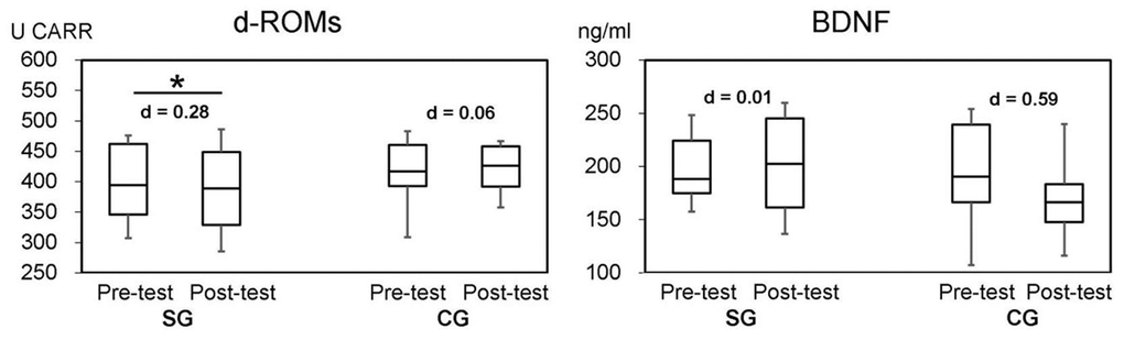 In Table 2 and Figure 3, the differences on d-ROMs and BDNF between groups were not significant (P=0.570 in d-ROMs and P=0.148 in BDNF). In SG, the result was significantly decreased in oxidative stress markers (d-ROMs) (P=0.039) after SYNAP intervention. In addition, the effect size (Cohen’s d) was “small” (d=0.28) in d-ROMs and “no effect” in BDNF (d=0.01). The effect size in CG was “moderate” in BDNF (d=0.59) and “no effect” in d-ROMs (d=0.06).