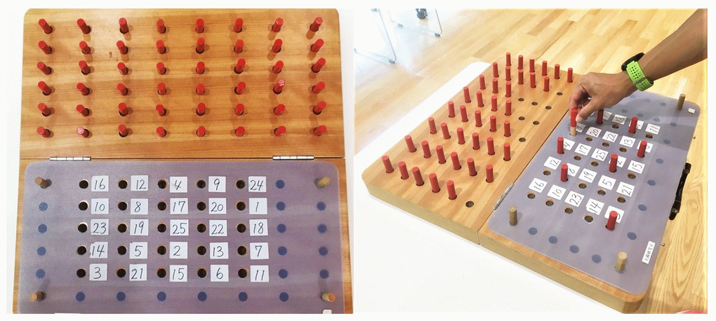 In the TMPT, the participants were asked to place 25 pegs in 25 randomly numbered holes on a board in numerical order from 1 to 25 and subsequently remove them as quickly as possible (Figure 5). This requires a visual-scanning task to locate the numbered holes and move the 25 pegs. We used the TTKK 1306 peg board (Takei Scientific Instruments Co. Ltd., Niigata, Japan), and recorded the time required for participants to finish moving 25 pegs.
