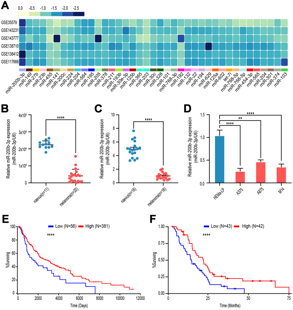 In order to identify genes that may be involved in melanoma, we analyzed differential miRNAs according to several GEO datasets (GSE35579, GSE143231, GSE143777, GSE138710, GSE138412 and GSE117666). To identify the possible target gene of miR-200b-3p in melanoma, bioinformatics analysis was conducted using several bioinformatics databases including PITA (http://genie.weizmann.ac.il/pubs/mir07/mir07_data.html), microT (https://bio.tools/DIANA-microT), TargetScan (http://www.targetscan.org/vert_72/) and RNA sequencing results of GSE149941. The survival time and immune infiltration were analyzed according to TCGA database.