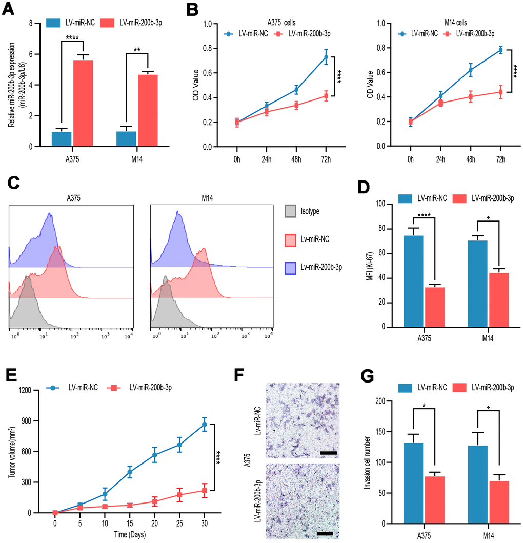 To explore the function of miR-200p-3b in melanoma cells, we overexpressed miR-200p-3b in A375 and M14 cells by lentiviral transfection and a high-efficiency of interference was verified by RT-qPCR (Figure 2A). Compared with the miR-control groups, transduction with LV-miR-200p-3b inhibited proliferation in A375 and M14 cell lines according to CCK-8 assay (Figure 2B). Ki-67 is considered a good marker of proliferation. At least 10000 cells were detected in flow cytometry assays and statistical data showed that miR-200p-3b overexpression inhibited cell proliferation proved by a decreased level of Ki-67 (Figure 2C, 2D). In vivo, a xenograft mouse model was constructed after LV-miR-200b-3p or mock transfected A375 cells were subcutaneously injected in nude mice. Subsequently, we closely observed the development of tumors and noticed that miR-200b-3p overexpression xenografts developed much slower than those of the mock group (Figure 2E). As for invasion, transwell assays showed that overexpression of miR-200b-3p reduced invasion of melanoma cells (Figure 2F, 2G). These results revealed that miR-200b-3p inhibited cell proliferation and invasion in melanoma cells.