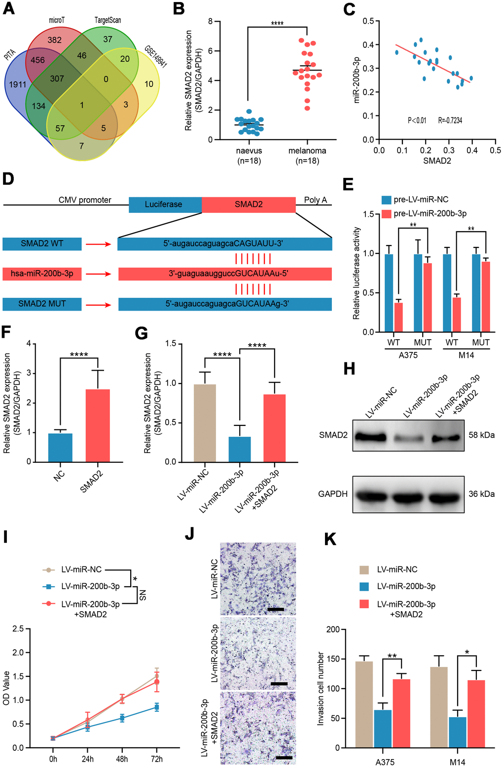 To identify the possible target gene of miR-200b-3p in melanoma, bioinformatics analysis was conducted using several bioinformatics databases including PITA, microT, TargetScan and RNA sequencing data of GSE149941. SMAD2 was the only one potential target gene in the interaction (Figure 3A). Hence, we verified the expression of SMAD2 in benign nevus (n=18) and malignant melanoma tissues (n=18) by RT-qPCR. It was shown that SMAD2 was significantly upregulated in melanoma tissues compared with benign naevus (Figure 3B). In addition, Spearman’s correlation analysis depicted a negative correlation between expressions of miR-200b-3p and SMAD2 in the 18 melanoma tissue samples (R=−0.7234, P < 0.01) (Figure 3C). Multiple sequence comparison analysis indicated that there was a possible miR-200b-3p binding site in the SMAD2 3'-UTR sequence (Figure 3D). Thus, in A375 and M14 cells, luciferase reporter assays were conducted to identify whether SMAD2 was directly bound by miR-200b-3p. We constructed vectors encoding the partial 3'-UTR sequence of SMAD2, which included the potential miR-200b-3p binding site. Following co-transduction with LV-miR-200b-3p and the vector carrying the wild-type sequence containing the SMAD2 3'-UTR, the luminescence intensity of SMAD2 was significantly reduced, which implied a direct binding of miR-200b-3p and SMAD2 (Figure 3E). Next, we constructed SMAD2 overexpression plasmid and the efficiency was confirmed by RT-qPCR (Figure 3F). Rescue assays showed that LV-miRNA-200b-3p effectively down-regulated SMAD2, while SMAD2 overexpression plasmid could reverse this phenomenon in both of genetic and protein levels (Figure 3G, 3H). As for bio-function, up-regulated SMAD2 could partly reverse the proliferation and invasion inhibiting effects of LV-miRNA-200b-3p (Figure 3I–3K). Taken together, these results confirmed that SMAD2 was directly modulated by miR-200b-3p as a target in melanoma cells.