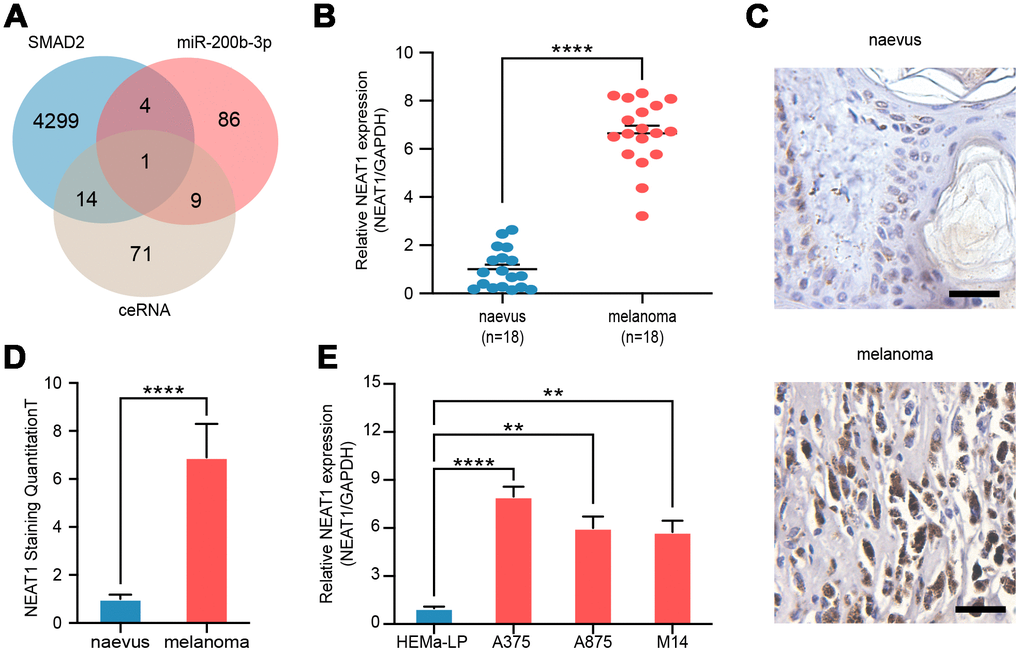 To explore the potential upstream regulation mechanism, we analyzed miR-200b-3p-related lncRNAs, SMAD2-related lncRNAs, and potential lncRNAs in ceRNA regulatory axis and found that the lncRNA NEAT1 was predicted to associate with miR-200b-3p and SMAD2 as a ceRNA (Figure 4A). RT-qPCR and RNAscope assays revealed that expression of NEAT1 in melanoma tissues (n=18) was significantly higher than that in benign naevus (n=18) (Figure 4B–4D). Furthermore, the level of NEAT1 in various melanoma cell lines (A375, A875 and M14) was found to be higher than that of non-cancer cells as well (Figure 4E). These results showed that NEAT1 was up-regulated in melanoma cells.