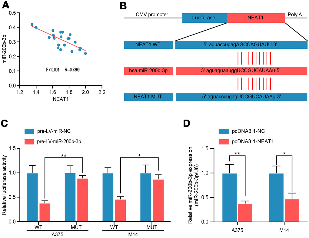 To confirm the regulatory relationship between NEAT1 and miR-200b-3p, we analyzed their correlation by Pearson’s analysis and found a negative correlation between NEAT1 and miR-200b-3p in melanoma tissues (R= −0.7369, P<0.001) (Figure 5A). Subsequently, to search for the binding site of miR-200b-3p in the NEAT1 sequence, another multiple sequence comparison analysis was performed (Figure 5B). Luciferase reporter assay demonstrated a considerable decrease in luciferase activity caused by miR-200b-3p in A375 and M14 cells; these inhibitory effects of miR-200b-3p overexpression were abrogated in cells transfected with MUT NEAT1, which reflected the direct binding and endogenous competition (Figure 5C). Moreover, overexpression of NEAT1 decreased miR-200b-3p level in A375 and M14 (Figure 5D). From these results above, we can conclude that NEAT1 suppressed miR-200b-3p as a miRNA sponge in melanoma.
