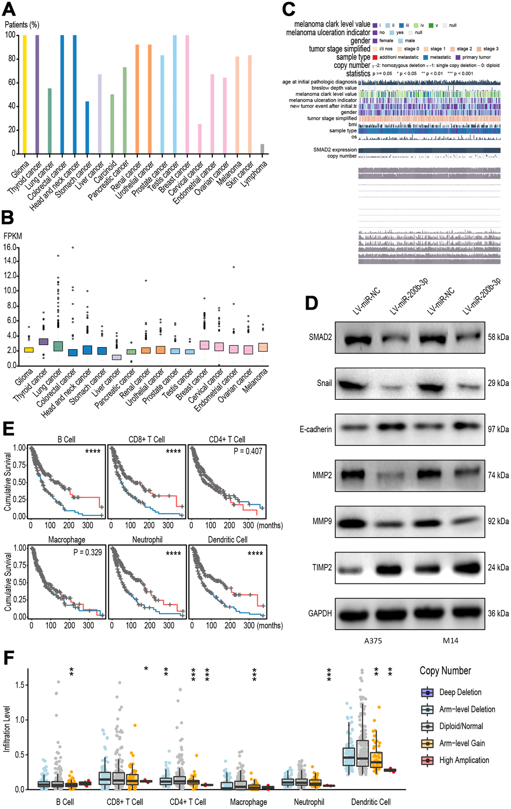 To verify the tumor promoting function of SMAD2 in pan-cancer tissues, we analyzed the positive rates of SMAD2 in several cancer tissues. As shown, most cancers were exhibited as SMAD2 positive, such as colorectal, endometrial, ovarian, renal and thyroid cancers, which indicated that SMAD2 widely expressed in a variety of cancer cells (Figure 8A). In addition, transcription level of SMAD2 was significantly increased in 17 types of cancer tissues, which indicated that SMAD2 had low cancer specificity (Figure 8B). Considering the sequencing data and clinical characteristic, SMAD2 was related with several signaling pathways (Figure 8C). Western blot determined that overexpression of miR-200b-3p in A375 and M14 cells led to the downregulation of SMAD2, and suppressed major SMAD2-associated signaling, including the EMT process(verified by Snail and E-cadherin proteins) and cell invasion (verified by MMP2, MMP9 and TIMP2 proteins) (Figure 8D). To explore the clinical relevance of tumor immune subsets, with the flexibility to correct for multiple covariates in a multivariable Cox proportional hazard model, we drawn Kaplan-Meier plots for immune infiltrates to visualize the survival differences according to TCGA database. The patients were divided by high or low level of immune infiltrates of various types of immune cells. It was illustrated that high infiltrations of B cells, CD8+ T cells, neutrophils and dendritic cells were related to better survival outcomes (Figure 8E). Finally, we divided melanoma patients into 5 groups according to SMAD2 levels, immune infiltrates of immune cells were caculated according to SMAD2 levels and the results indicated that different levels of SMAD2 predicted diverse immune infiltration patterns, indicative of the correlation between SMAD2 and immune infiltrates (Figure 8F). In brief, it displayed that the NEAT1/miR-200b-3p/SMAD2 axis may promote melanoma by activating EMT and immune responses.