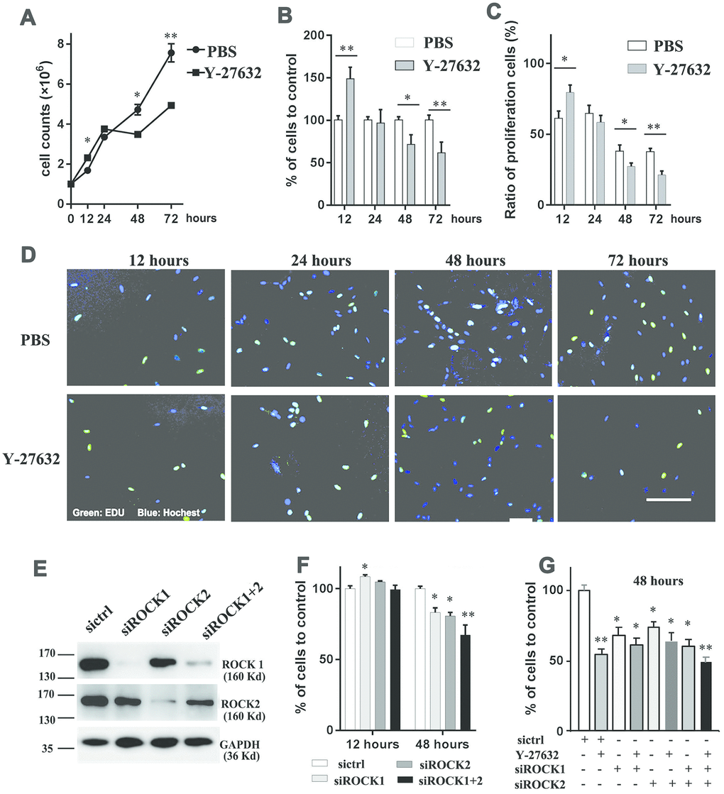 In order to elucidate the effects of Y-27632 on dermal cell growth, we cultured HDFs in the absence or presence of 10 μM Y-27632 for 12 to 72 h. As shown in Figure 1A, during the first 24 h of culture, Y-27632 treated HDFs grew faster than the PBS treated controls, however after that time, their growth was significantly inhibited compared to the PBS controls (Figure 1A). To further confirm that prolonged treatment with Y-27632 inhibits the growth of HDFs, a CCK8 cell counting assay was carried out with the same results (Figure 1B). The effect of Y-27632 on HDFs was quantified using EdU to stain proliferating cells. Figure 1D shows EdU-positive cells (green) at different time points with quantification of those results shown in Figure 1C. Again, the results confirmed that there are more proliferating HDFs at 12 h of Y-27632 treatment compared to PBS treated controls, and significantly fewer HDFs at 48 and 72 h (Figure 1C, 1D). In order to validate the effects of Y-27632 on HDFs derived in our laboratory, we treated commercial HDFs (cHDFs) in the same manner and obtained similar results (Supplementary Figure 1).