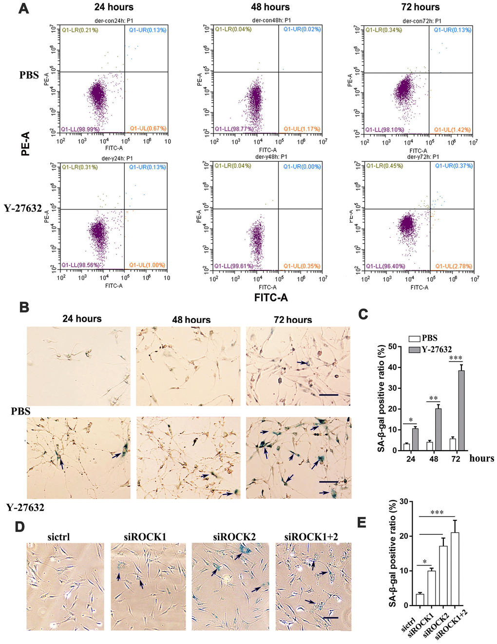 Next, we determined whether the inhibited growth of HDFs elicited by Y-27632 is due to an increase of cell death. First, we checked whether Y-27632 induces apoptosis in HDFs. The percentage of apoptotic cells (i.e. FITC- and PI-positive cells) did not change significantly between the control (PBS) and the Y-27632 treated groups at 24, 48 and 72 h after seeding (Figure 2A). Next, we tested whether Y-27632 promoted cellular senescence in HDFs. Using SA-β-gal staining to detect cellular senescence, we found that Y-27632 treatment did indeed increase the number of SA-β-gal-positive cells (arrows), i.e. senescent cells, at 24, 48 and 72 h after seeding (Figure 2B, 2C). Increased positive staining for SA-β-gal activity (arrows, Figure 2D) was also found in HDFs after knockdown of ROCK1/ROCK2 genes by siRNAs (Figure 2D, 2E). A similar result on cellular senescence elicited in commercial HDFs by Y-27632 was also confirmed (Supplementary Figure 3A, 3B). We further determined whether Y-27632 enhances cellular senescence by analyzing expression of the senescence marker Lamin B1 [42] and found that treatment with Y-27632 decreased Lamin B1 expression both in HDFs and in cHDFs (Supplementary Figure 3C). Taken together, these data suggest that Y-27632 enhances the senescence of HDFs, which results in the inhibition of their growth.