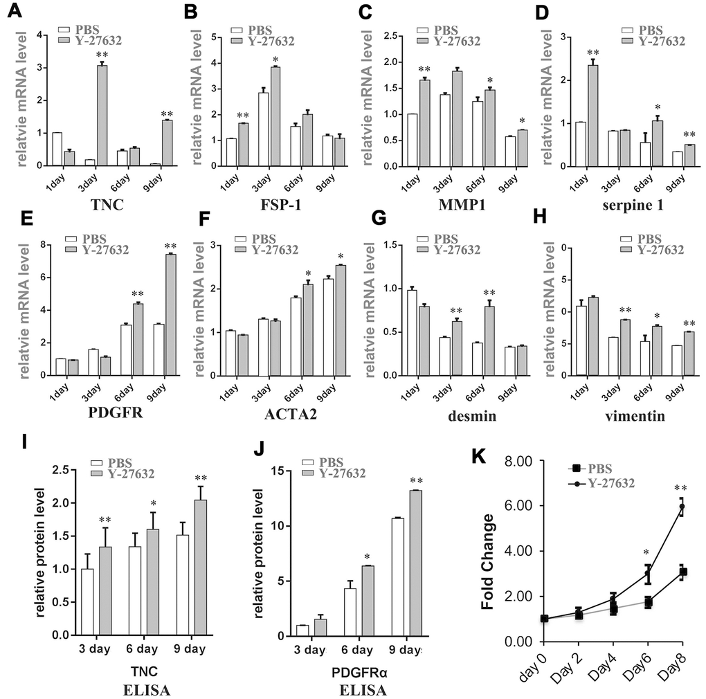 The senescence of stromal cells has been shown to be associated with the induction of CAF effector genes. In order to further investigate the behavior of senescent HDFs induced by ROCK inhibitors, we extended the treatment time of HDFs with Y-27632 to a much longer time (9 days), then collected these cells at different time points to analyze the expression of known CAF effector genes. RT-qPCR analysis showed that treatment with Y-27632 enhanced the mRNA expression levels of TNC, FSP-1, MMP1, serpine1, PDGFR, ACTA2, desmin and vimentin, a typical CAF expression pattern (Figure 3A–3H).