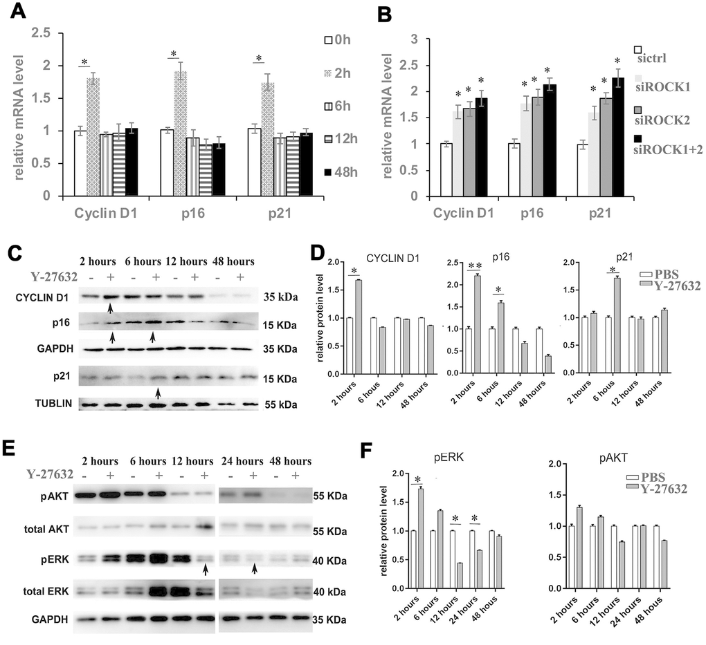 To further understand the effect of ROCK inhibition on the growth of HDFs, we studied the expression of cyclinD1, p16 and p21. RT-qPCR revealed that Y-27632 induces the expression of both the p16 and p21 genes, classic markers of cellular senescence, at early time points of treatment (Figure 4A). Those expression patterns of p16 and p21 were also found in Y-27632 treated cHDFs (Supplementary Figure 4A, 4B). Interestingly, Y-27632 also increased the expression of the proliferation marker cyclin D1 (Figure 4A). Consistent results were found with the siRNA mediated knockdown of ROCK gene expression (Figure 4B). These results were further confirmed by western-blot analysis (arrows, Figure 4C) and its corresponding quantification data (Figure 4D). Since HDFs treated with Y-27632 showed increased expression of cyclin D1, we tested if the classic pathways regulating cell proliferation and survival, i.e. the ERK and AKT pathways, are also affected. As shown in Figure 4E, 4F, the levels of phosphorylated ERK1/2 (pERK) were increased at earlier time points of treatment with Y-27632, but then appeared to significantly decrease (12h, 24h, arrows, Figure 4E, 4F). For the AKT activity, phosphorylated AKT also slightly increased at early time points of Y-27632 treatment, and decreased after 12 h, but these changes were not statistically significant (Figure 4E, 4F). Taken together, these data suggest that Y-27632 activates both the proliferation and the senescence pathways in HDFs at early time points of treatment, and corresponding changes of the ERK pathway were involved.