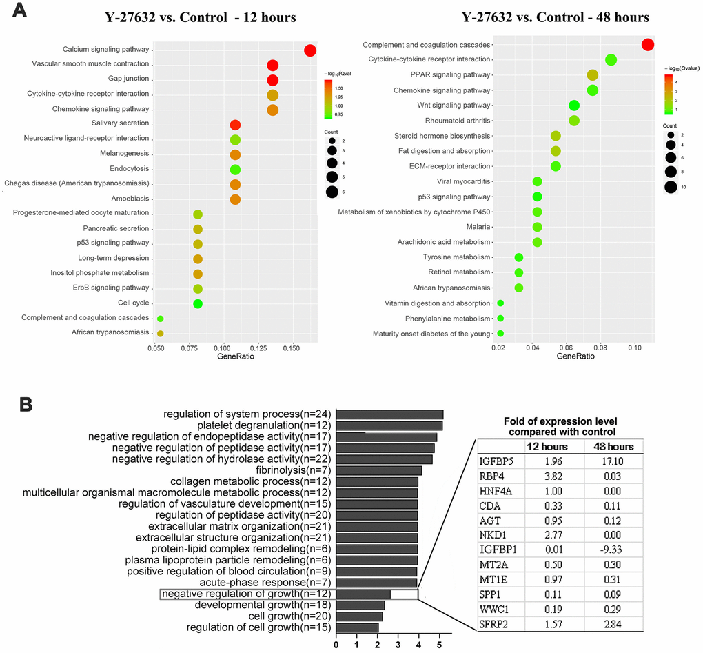 KEGG pathway analysis was performed to identify changed pathways for DEGs from 12 h to 48 h treatment of Y-27632, and the results showed that several signaling pathways related to cell growth and cellular senescence, such as cytokine, chemokine and p53 signaling pathways, were upregulated in the Y-27632 treated group at both time points (Figure 5A).We further sequenced 12 of the 239 DEGs at 48 h after Y-27632 treatment and identified genes that by GO analysis are negative regulators of cell growth (Figure 5B). Of those 12 genes in these two processes, the expression levels of 4 genes (IGFBP1, IGFBP-5, HNF4A and NKD1) changed significantly at both 12 h and 48 h of Y-27632 treatment. These results were validated by RT-qPCR analysis (Figure 6A), which showed that the expression of IGFBP-5 increased by 1.5-fold after 12 h of treatment with Y-27632, and increased more than 10-fold after 48 h of treatment. However, expression of the other 3 genes didn’t change significantly after Y-27632 treatment (Figure 6A). This effect of increased expression of IGFBP-5 elicited by Y-27632 was replicated using different HDFs derived from different donors, and was confirmed using cHDFs (Supplementary Figure 6A).