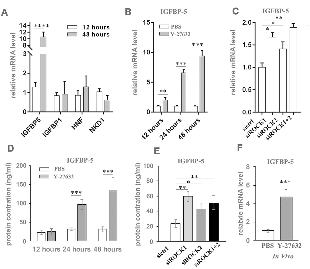 Again, we found that Y-27632 increased mRNA levels of IGFBP-5 in HDFs as early as at 12 h after treatment, with enhanced expression after 24 h (Figure 6B). The inhibition of ROCK by siRNA mediated knockdown also increased IGFBP-5 expression (Figure 6C). Since IGFBP-5 is a secreted protein that binds to insulin growth factors (IGFs), we next checked the protein level of IGFBP-5 in conditioned media collected from cultures of HDFs at different time points. We found that treatment with Y-27632 increased the protein level of IGFBP-5 in the culture medium (Figure 6D) and further, found that the culture media of ROCK knockdown HDFs also showed increased levels of IGFBP-5 (Figure 6E). To validate that Y-27632 enhances the expression of IGFBP-5 in HDFs in vivo, human skin reconstituted from grafting cultured HDFs together with human epidermal cells, was subcutaneously injected with 10 μM Y-27632 for 2 weeks. The reconstituted skin was then collected and dissected under a microscope to carefully separate the dermis from the epidermis, after which the dermis was processed to extract RNA for RT-PCR analysis of IGFBP-5 expression. We found that treatment with Y-27632 significantly induced IGFBP-5 expression dermal cells in vivo (Figure 6F). In summary, blocking ROCK function in HDFs significantly induces the expression, production and secretion of IGFBP-5 in vitro and likely also enhances its expression in vivo.