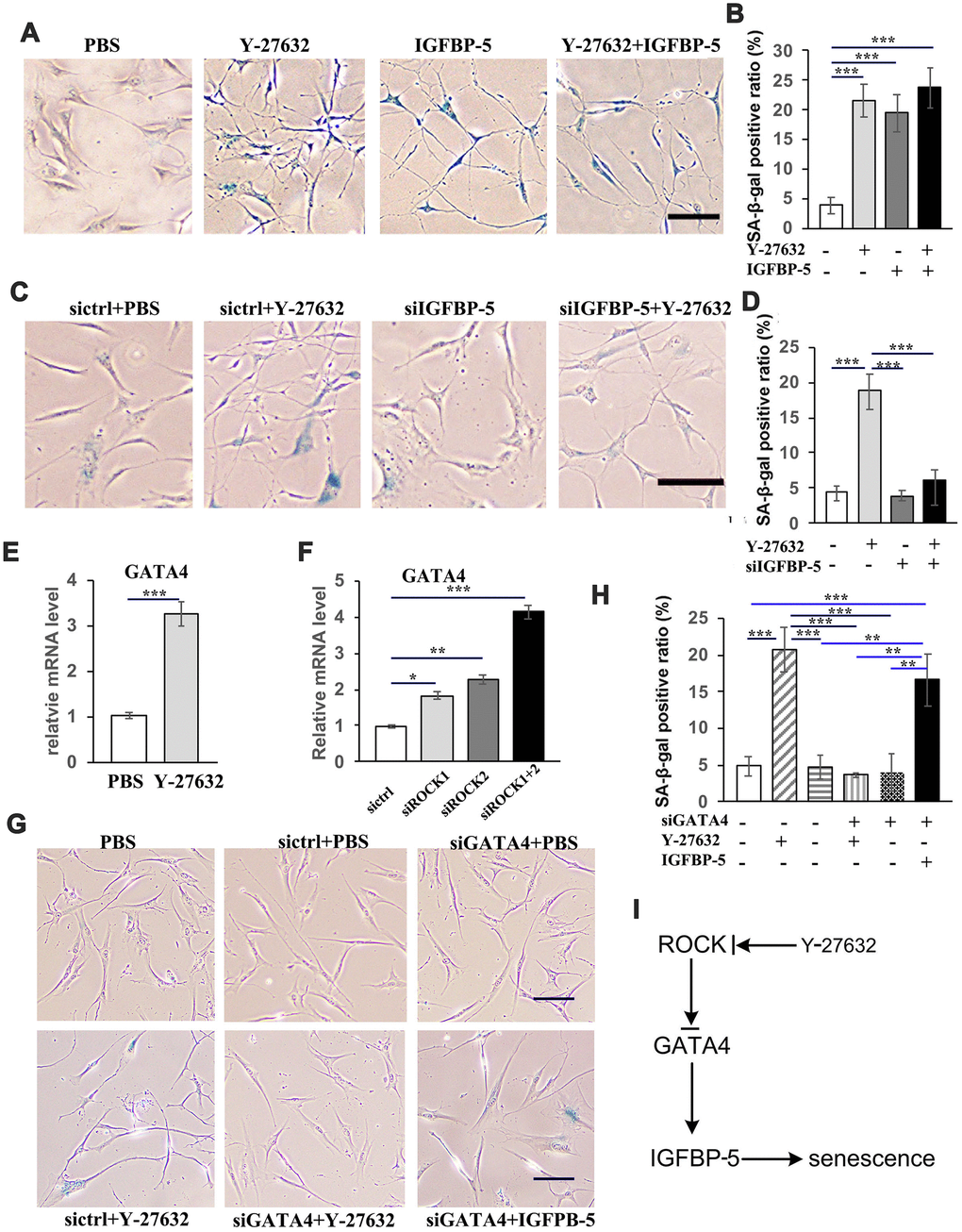 To rule out processes that enhance senescence elicited by Y-27632 at the late time points, we performed RNA-seq analysis of gene expression profiles of HDFs collected after 12 h and 48 h of treatment with Y-27632. From those analyses we identified IGFBP-5, a negative regulator of cell proliferation, whose expression increased with the duration of Y-27632 treatment (a 7-fold increase after the first 24 h, Figure 6A). IGFBP-5 and other IGFBP family members have been reported to induce premature senescence in human fibroblasts and endothelial cells [51, 52] and to suppress the growth of several types of tumor cells [53–56]. We found that the addition of IGFBP-5 protein promotes the senescence of HDFs (Figure 7A, 7B), and that the senescence-inducing effect of Y-27632 was blocked by the knockdown of IGFBP-5 in HDFs (Figure 7C, 7D). Analyses of binding motifs showed that there are candidate motifs upstream in the IGFBP-5 gene that are recognized by the transcription factor GATA4. It has been reported that the activation of GATA4 is regulated by ROCK through the ERK/MAPK pathway [43], and that the knockdown of GATA4 decreases the expression level of IGFBP-5 in response to cAMP treatment of granulosa cells [44]. Our results show that the expression of GATA4 is increased in Y-27632-treated and ROCK1/2-knockdown HDFs (Figure 7E, 7F), suggesting that ROCK may control the expression of GATA4 in HDFs. Since we found that knockdown of GATA4 blocked the increased senescence induced by Y-27632 (Figure 7G, 7H), we infer that the Rock inhibitor induces senescence in HDFs by regulating the expression of GATA4 and IGFBP-5 (Figure 7I). Nevertheless, the detailed mechanism by which ROCK inhibition controls the level of GATA4 and IGFBP-5 still needs further clarification.