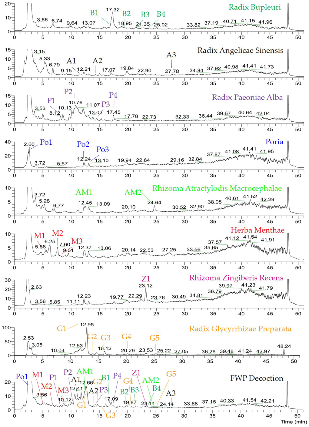 As shown in Figure 1, the chromatographic fingerprints were constructed firstly for FWP and each herb. Then 23 peaks were identified by comparing their UV and MS spectra with published data or standard compounds (Table 1, Figure 2): D-Fructose (Po1), Lithospermic acid (M1), Rosmarinic acid (M2), Oxypaeoniflorin (P1), 3,4-Dihydroxybenzaldehyde (M3), Albiflorin (P2), Anisic acid (A1), 7-Hydroxycoumarin (AM1), Glycyrrhizic acid (G1), Angelol A (A2), Lactiflorin (P3), Ononin (G2), 4',7-Dihydroxyflavone (G3), Saikosaponin C (B1), Benzoylpaeoniflorin (P4), Saikosaponin F (B2), Formononetin (G4), Saikosaponin A (B3), 6-Gingerol (Z1), Saikosaponin E (B4), Licoflavone A (G5), Atractylenolide III (AM2) and Ligustilide (A3).