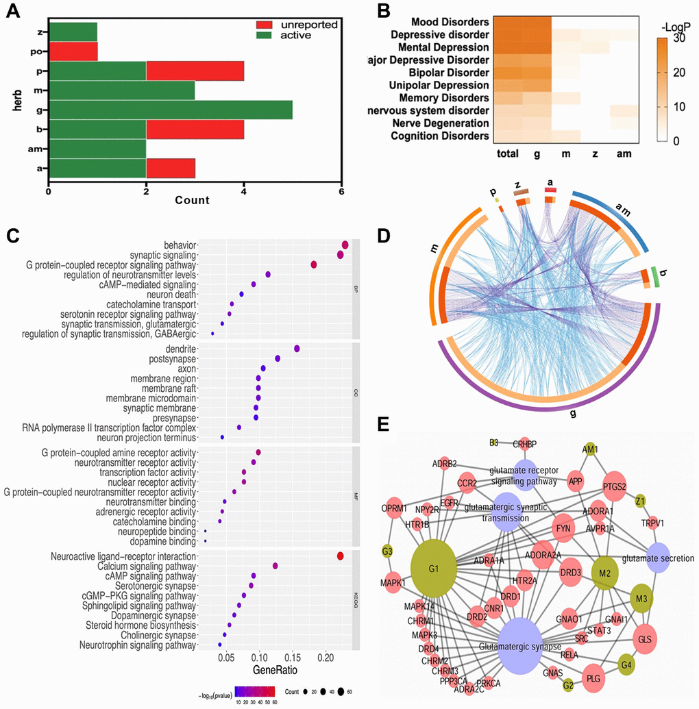 Targets of FWP and each herb were mapped into DisGenNET database [46] through Metascape [47]. The accumulative hypergeometric p-values were calculated to filter the statistically enriched terms. Then, the enriched diseases related to depression were analyzed for each herb in FWP and visualized using heatmap of -Log P value.