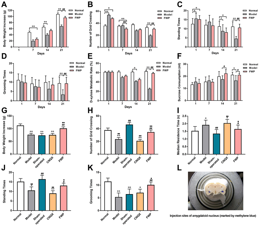 The general state, body weight increase and behaviour in OFT were evaluated on day 21. Compared with model rats, there was not difference in sham-operated and CNQX groups, but significant alleviation in FWP group (P<0.01). On day 25, compared with normal rats, model rats exhibited depression-like behaviours with body weight increasing slowly (P<0.01, Figure 4G–4K). Compared with model, sham-operated rats suffered acute stress of operation and were irritable and hyperactive, with increased grid crossing counts, standing times and grooming times, as well as decreased residence times (P<0.01). These behavior changes were reversed significantly after FWP and CNQX treatment (P<0.05). In detail, FWP showed mild callback effect, whereas CNQX had an excessive effect. Moreover, compared with model, operation or CNQX treatment showed similar slow weight gain, while FWP treatment showed rapid weight gain on day 25 (Figure 4G). Therefore, FWP seemed to have a better regulatory effect.