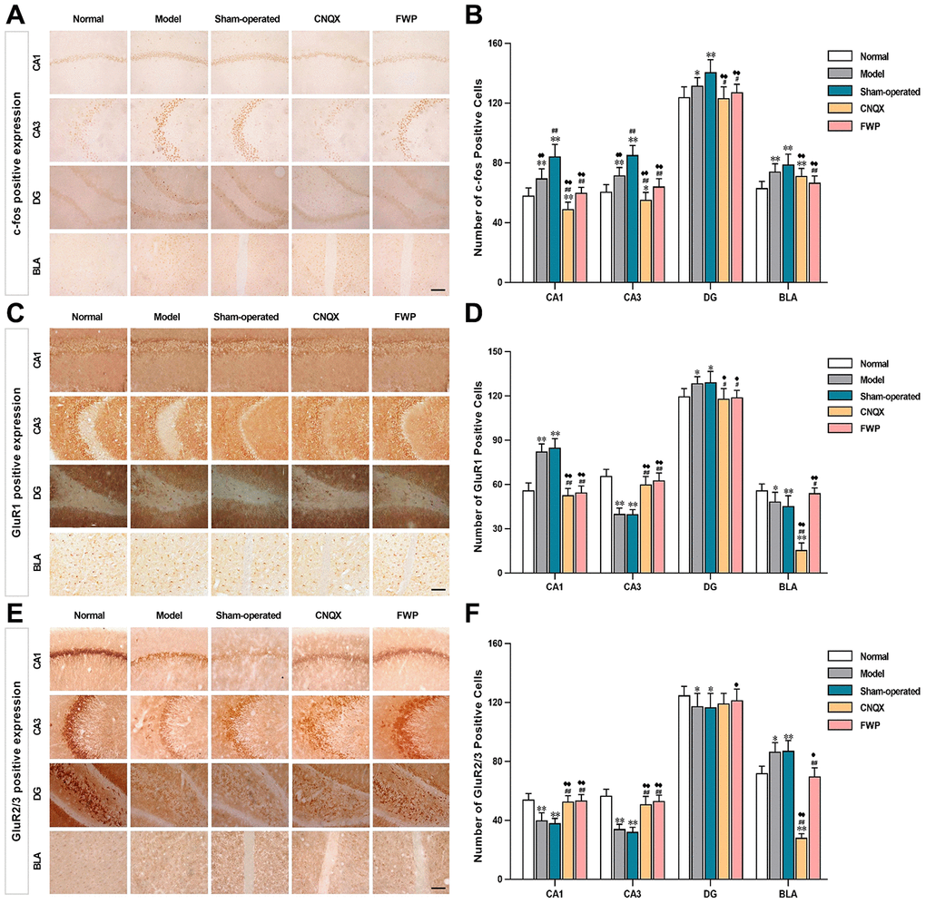 The similar immunohistochemical changes between FWP and CNQX groups suggested that FWP had a positive and balanced effect via antagonizing the AMPA receptor in amygdala. FWP inhibited AMPA receptor excitability, reduced the intensity of hippocampal stimulation and related damage.