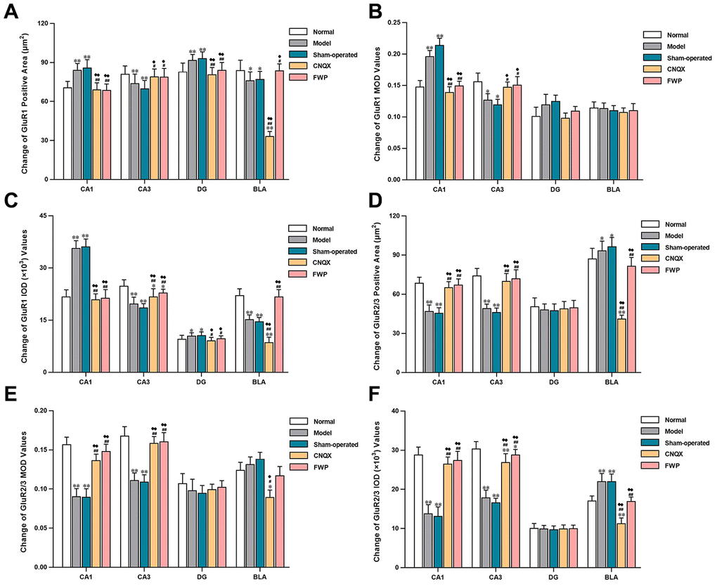 Specific GluR2/3 staining (brownish yellow) was concentrated in cerebral cortex, hippocampus, amygdala and hypothalamus, while almost colourless in other parts (Figure 5E). The stained neurons were circular, with darkly stained surface of nerve fiber and cell body. The cytoplasm and nuclei were not stained. Within the hippocampus, staining was especially prominent in soma layer, concentrated in the granular layer of DG, obvious in the initial/radiation/molecular layers, and almost colourless in the transparent layer of CA3. The amygdala was slightly more staining than cortex. Compared with control, there were significantly less neurons with GluR2/3 immunoreactivity in CA1, CA3 and DG, and significantly more in BLA in model and sham-operated groups (P<0.05 or P<0.01). There were slightly decreased neurons with GluR2/3 immunoreactivity in FWP group (P>0.05). Compared with model and sham-operated groups, there were significantly more neurons with GluR2/3 immunoreactivity in CA1, CA3 and DG, while significantly less in BLA in CNQX and FWP group (P<0.05 or P<0.01, except for result in DG of CNQX group: P>0.05, Figure 5F). For positive area change, IOD, and MOD, there were similar results in CA1, CA3 and BLA region, while no expression difference in DG region (Figure 6).