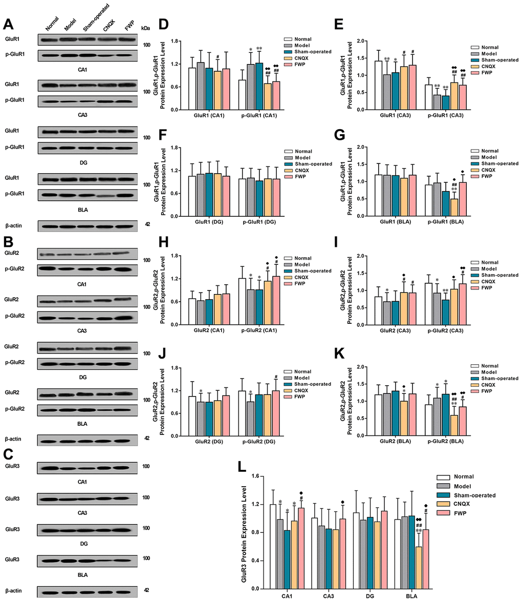 Compared with normal group, CRS in model group decreased GluR1 and p-GluR1 protein expression in CA3, GluR2 in CA3 and DG, p-GluR2 in CA1, CA3, and DG, and GluR3 in CA1 (P<0.05 or P<0.01), which were reversed by FWP treatment (P<0.05 or P<0.01, except for GluR2 in DG). Meanwhile, CRS increased p-GluR1 in CA1, p-GluR2 in BLA, which were also reversed by FWP treatment (P<0.05 or P<0.01). Compared with normal rats, rats in sham-operated group showed decreased expression of GluR1 and p-GluR1 in CA3, p-GluR2 in CA1 and CA3, and GluR3 in CA1 (P<0.05 or P<0.01), which were reversed by FWP treatment (P<0.05 or P<0.01, except for GluR2 in DG). Meanwhile, rats in sham-operated group showed increased expression p-GluR1 in CA1, p-GluR2 in BLA, which were also reversed by FWP treatment (P<0.05 or P<0.01, Figure 7). Results showed that FWP mainly regulated the phosphorylated form of protein GluR1 and GluR2.