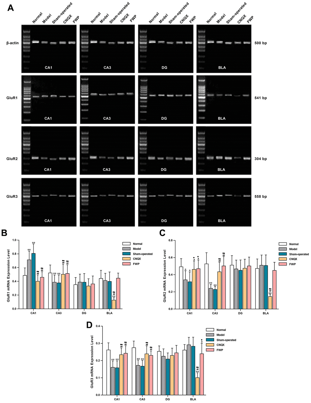 Compared with control, gene expression of the AMPA receptor subunits GluR1 were increased in CA1 and DG, and decreased in CA3 and BLA in model and sham-operated groups (P<0.01 in CA1 and CA3). The gene expressions of GluR2 and GluR3 were decreased in CA1, CA2, and CA3, and increased in BLA (P<0.01 in CA1 and CA3). The dysregulated expressions of GluR1, GluR2 and GluR3 were alleviated after FWP and CNQX treatment (P<0.05 or 0.01 in CA1 and CA3, Figure 8). Patterns of gene expression were consistent with protein expression and distribution for different AMPA receptor subunits.