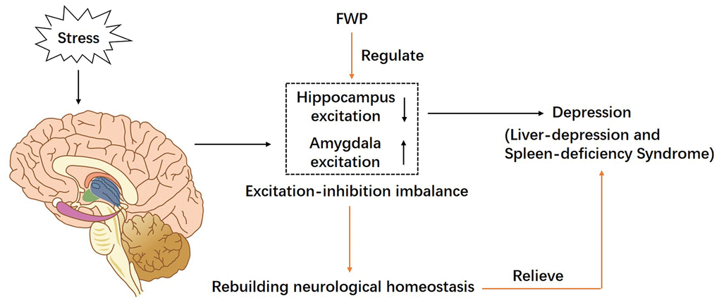 In the current study, we present evidence that FWP alleviates chronic stress induced depressive mood and physical changes, which mimics clinical LDSDS. The impaired synaptic plasticity and subsequent dysfunction of hippocampus (atrophy) and BLA (hypertrophy) are mainly improved by FWP treatment, which explains that limbic system is a major somatic organ affected in LDSDS. Interestingly, systematic bioinformatics analysis shows that different herbs in FWP synergistically regulate different parts of the same biological processes, which are mainly mapped into synapse function and neurotransmitter receptors. Nine compounds of 5 herbs in FWP regulates glutamate receptor signaling, glutamatergic synaptic transmission, glutamatergic synapse, and glutamate secretion. Our in vivo results are the first to demonstrate a potential mechanism of FWP regulating c-Fos expression via modifying the disturbed AMPAR homeostasis differently in different regions of hippocampus and BLA.