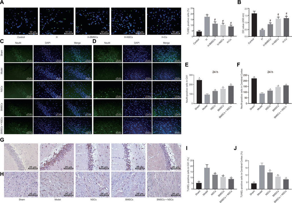 BMSCs, NSCs alone or in combination were transplanted into the CA model rats, followed by Neurological Deficit Scoring (NDS) on the neurological function (Table 1). Results showed that treatment of NSCs, BMSCs or BMSCs + NSCs led to a significantly lower score compared to the rats without any treatment while the reduction was noteworthy in rats treated with BMSCs + NSCs, indicating that the combination transplantation of BMSCs and NSCs facilitated the recovery of cerebral injury induced by CA. Then, NeuN-positive cells at 24 h in the cerebral cortex and the hippocampal CA1 region were detected using immunofluorescence staining (Figure 2C–2F). The findings revealed that the number of NeuN-positive cells was elevated upon treatment with NSCs, BMSCs or BMSCs + NSCs, and the increase was most significant upon treatment with BMSCs + NSCs (all p < 0.05). TUNEL staining (Figure 2G–2J) also verified that apoptosis in the presence of BMSCs + NSCs was significantly inhibited (p < 0.05). Conjointly, a combination of BMSC and NSC transplantation could increase the number of NeuN-positive cells and reduce neuronal cell apoptosis in rats with CA.