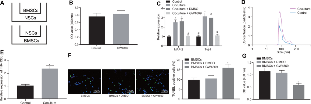 With results eliciting the therapeutic effects of a combination of BMSCs and NSCs, we speculated an underlying interaction between BMSCs and NSCs to support their functionality. For exploration purpose, the BMSCs and NSCs were co-cultured in an indirect manner. Firstly, the effects of BMSCs on NSCs were investigated. During co-culture, NSCs placed in the basolateral chambers were co-cultured with BMSCs with addition of dimethyl sulfoxide (DMSO) or GW4869 (an inhibitor for EVs) in the apical chambers to evaluate the differentiation of NSCs (Figure 3A). Our results elicited that GW4869 treatment did not affect the viability of the cultured normal NSCs (Figure 3B). Following culture for 2 weeks, reverse transcription quantitative polymerase chain reaction (RT-qPCR) was conducted to measure the expression profiles of markers (MAP-2 and Tuj-1) (Figure 3C). Results showed that compared with the NSCs alone, co-culture of BMSCs and NSCs significantly promoted the expression of MAP-2 and Tuj-1 while the addition of GW4869 reduced the expression of MAP-2 and Tuj-1, suggesting that BMSCs contributed to the differentiation of NSCs into neuronal cells depending on the release of EVs. Subsequently, the effects of NSCs on BMSCs were explored. During co-culture, BMSCs were placed in the basolateral chambers with/without the addition of NSCs. The culture medium of BMSCs was collected to extract the EVs, followed by a regimen NTA (Figure 3D). Results revealed the release of EVs from BMSCs and a significantly higher concentration of EVs in the presence of NSCs, indicating an interaction between BMSCs and NSCs. In addition, our results revealed that the NSCs lead to an upregulated miR-133b in BMSCs-derived EVs (Figure 3E).