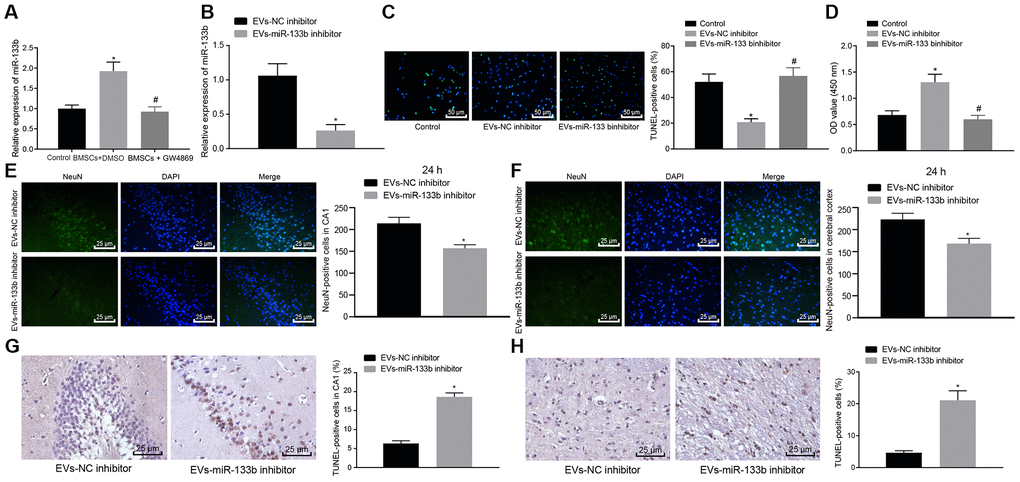 With the aforementioned findings ascertaining that the co-culture of NSCs and BMSCs could promote the expression of miR-133b in EVs derived from BMSCs and EVs could be protective of the neuronal cells, we hypothesized that miR-133b shuttled by EVs might be functional. RT-qPCR was performed to determine the expression profile of miR-133b in neuronal cells after co-culture with BMSCs (Figure 4A). Results revealed markedly up-regulated level of miR-133b in neuronal cells co-cultured with BMSCs and treated with DMSO compared with the untreated neuronal cells, whereas a significantly lower miR-133b expression was observed in response to GW4869 treatment in the neuronal cells co-cultured with BMSCs, suggesting that EVs might serve as a conveyance of miR-133b to the neuronal cells. Next, EVs derived from the BMSCs infected with the NC inhibitor or miR-133b inhibitor were co-cultured with the neuronal cells. As detected by means of RT-qPCR (Figure 4B), TUNEL assay (Figure 4C) and CCK-8 assay (Figure 4D), treatment with EVs derived from the NC inhibitor-treated BMSCs markedly stimulated the survival and inhibited the apoptosis of neuronal cells compared to the untreated neuronal cells. Additionally, the miR-133b expression was diminished in response to treatment with EVs derived from the miR-133b inhibitor-treated BMSCs accompanied by suppressed neuronal cell survival and promoted apoptosis. The following experiments were conducted to investigate validate the effects of miR-133b in EVs derived from BMSCs on cell apoptosis in vivo. EVs were extracted from BMSCs infected with NC inhibitor or miR-133b inhibitor and then injected in both ventricles of rats with CA. Results of immunofluorescence assay (Figure 4E, 4F) and TUNEL assay (Figure 4G, 4H) showed that NeuN-positive cells at 24 h in the cerebral cortex and hippocampal CA1 region significantly decreased after treatment with EVs derived from the miR-133b inhibitor-treated BMSCs along with increased cell apoptosis. Altogether, these results confirmed the functional role of miR-133b in EVs derived from BMSCs.